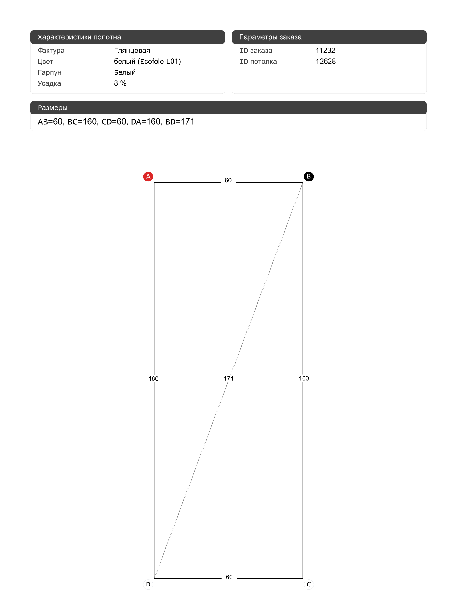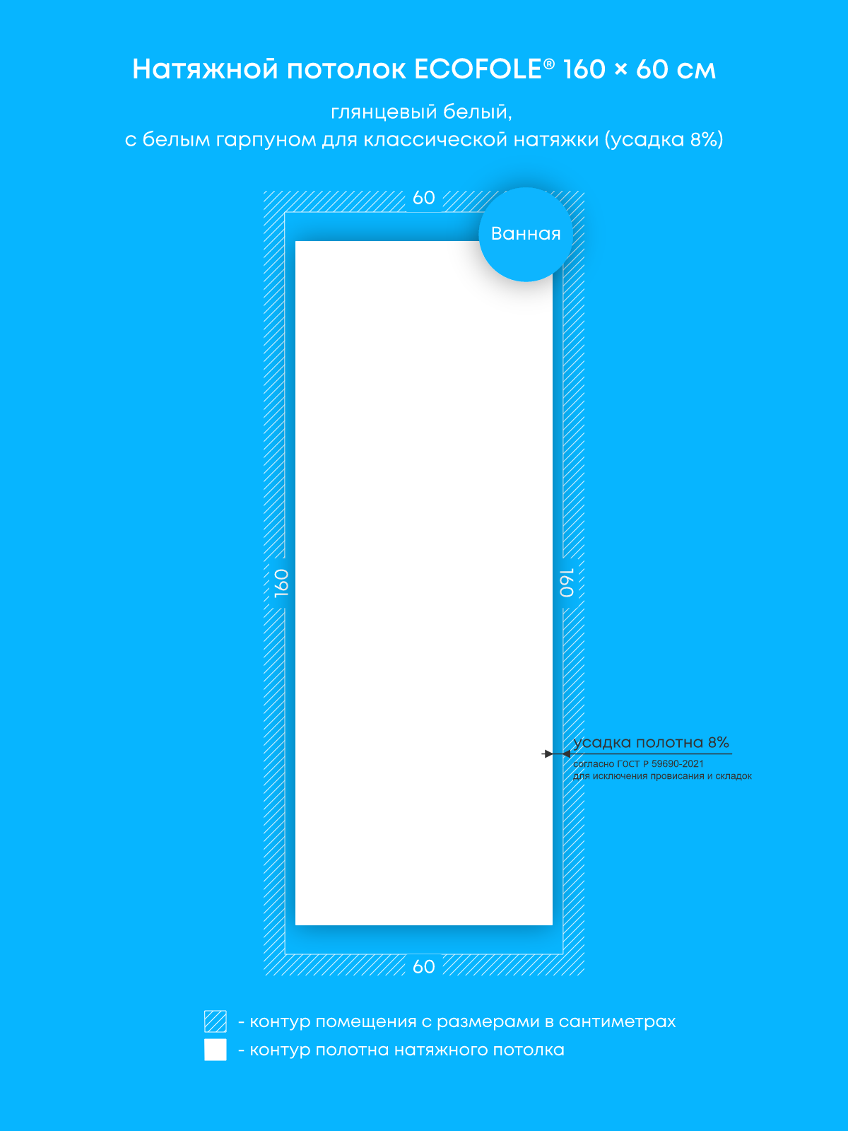 Натяжной потолок белый глянцевый, классической натяжки, изготовленный по индивидуальным размерам покупателя, для помещения площадью 1 м2