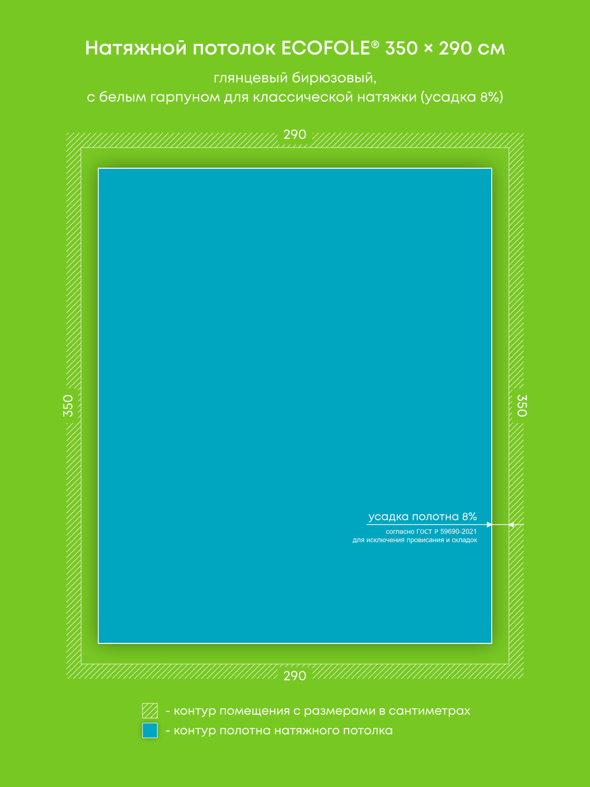 Натяжной потолок бирюзовый глянцевый, изготовленный по индивидуальным размерам покупателя, для спальни площадью 10.2 м2