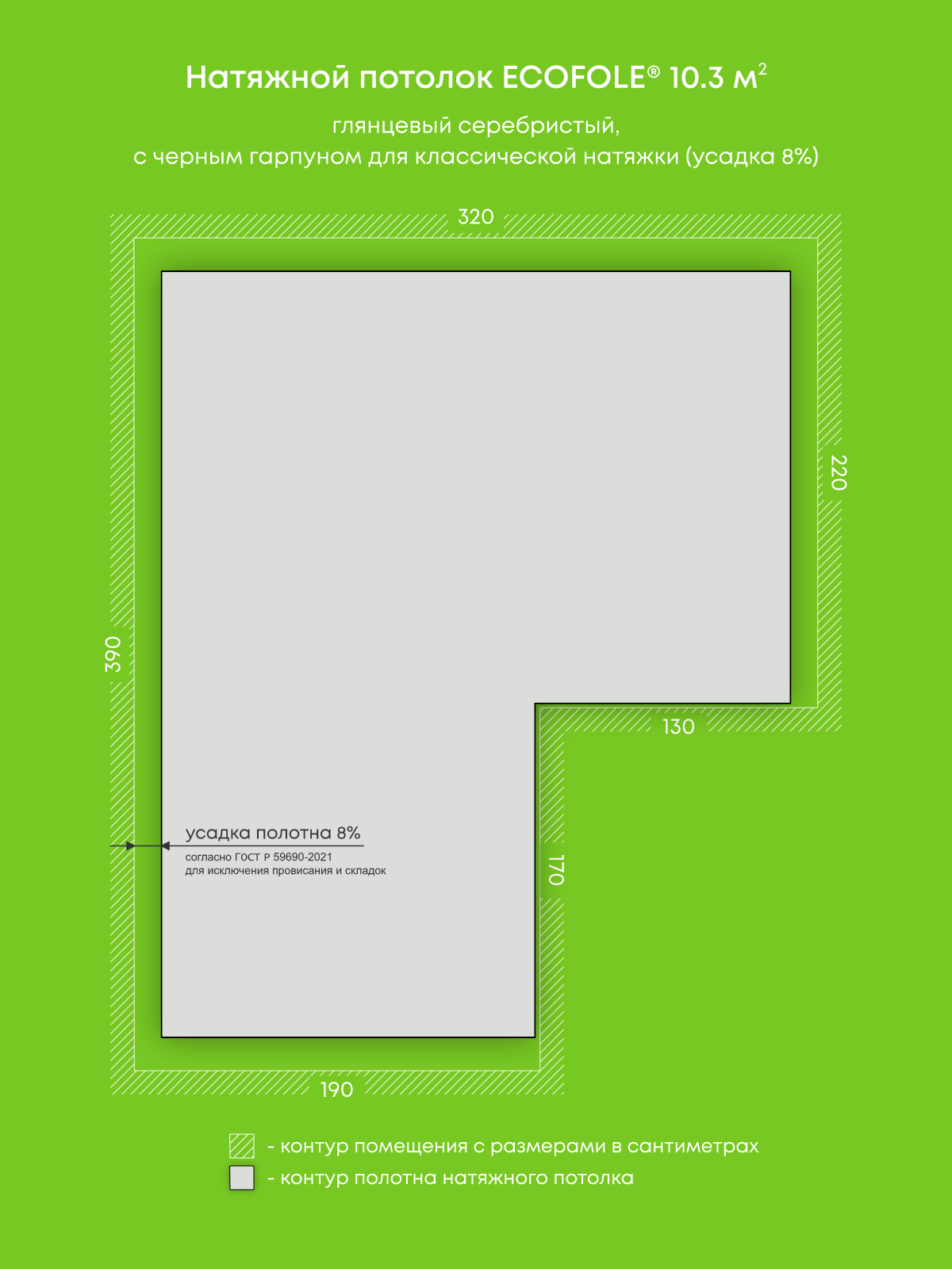 Натяжной потолок серебристый глянцевый, изготовленный по индивидуальным размерам покупателя, для комнаты площадью 10.3 м2