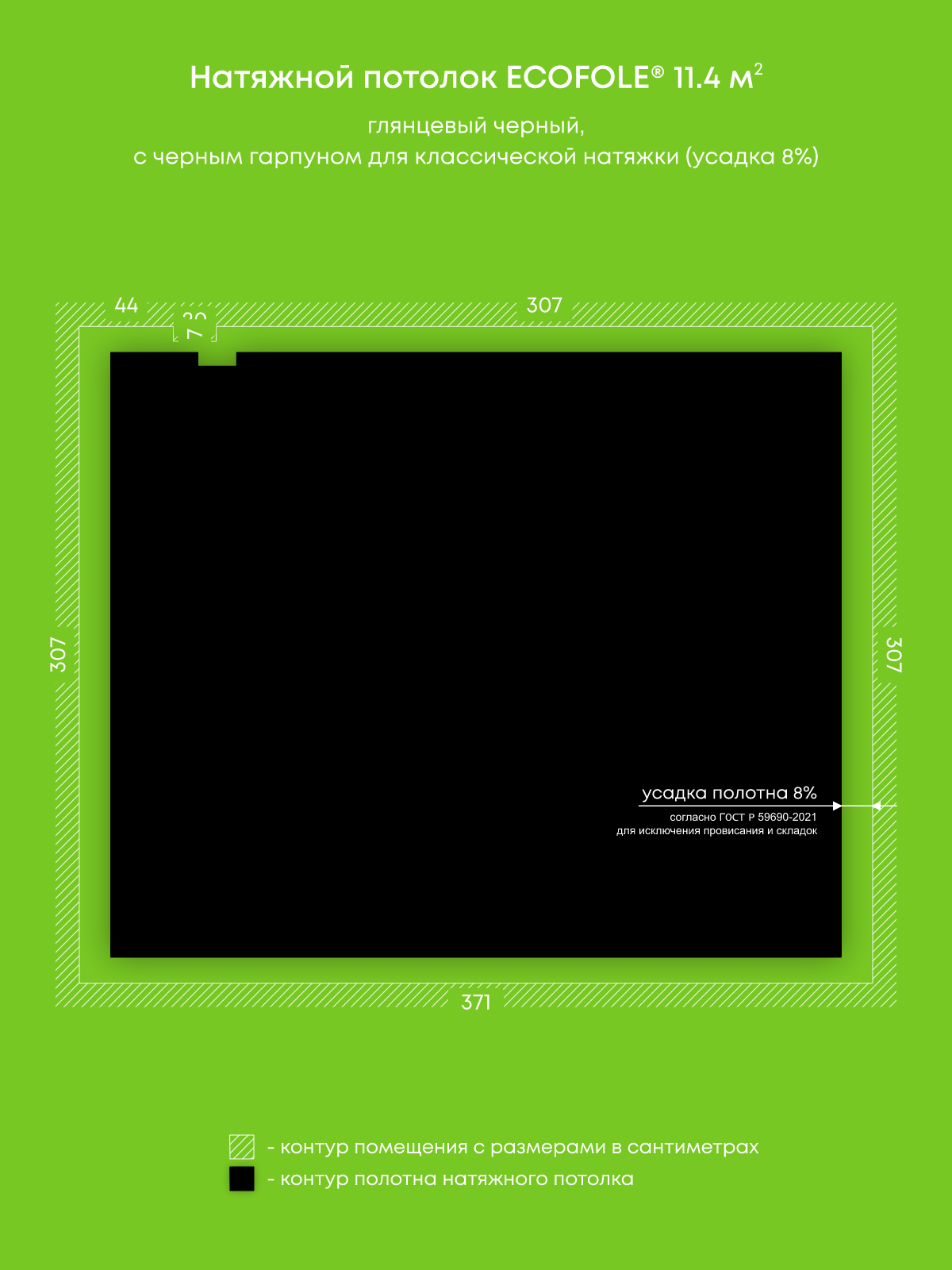 Натяжной потолок черный глянцевый, изготовленный по индивидуальным размерам покупателя, для помещения площадью 11.4 м2