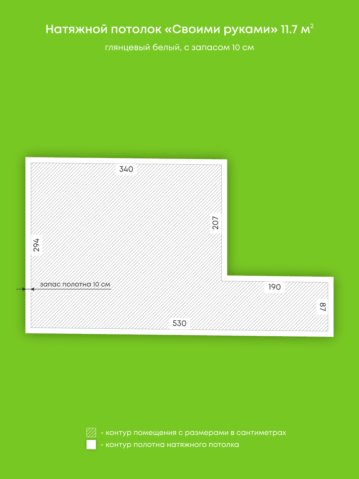 Натяжной потолок белый глянцевый, изготовленный по индивидуальным размерам покупателя, для комнаты площадью 11.7 м2
