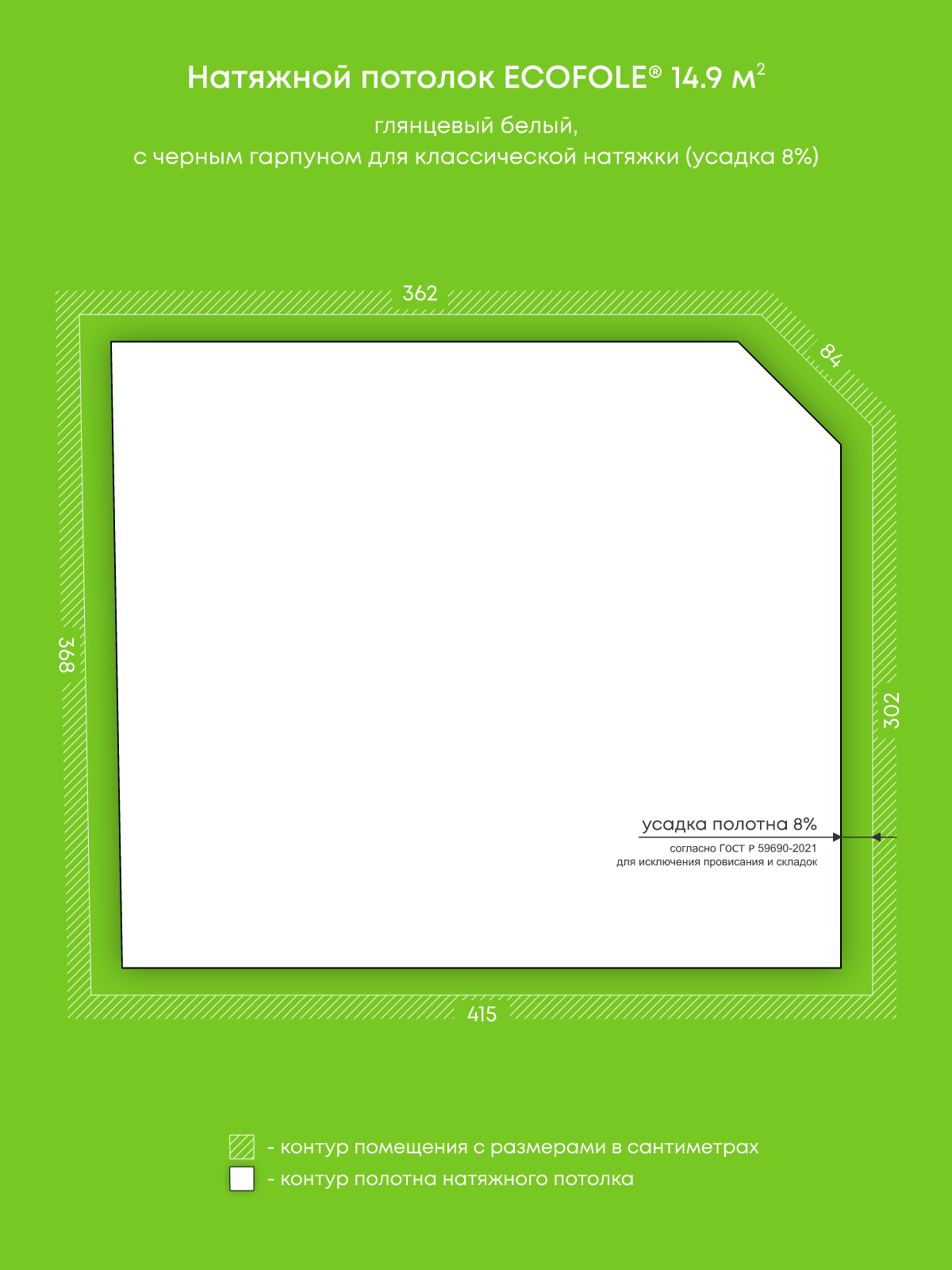 Натяжной потолок белый глянцевый, изготовленный по индивидуальным размерам покупателя, для комнаты площадью 14.9 м2