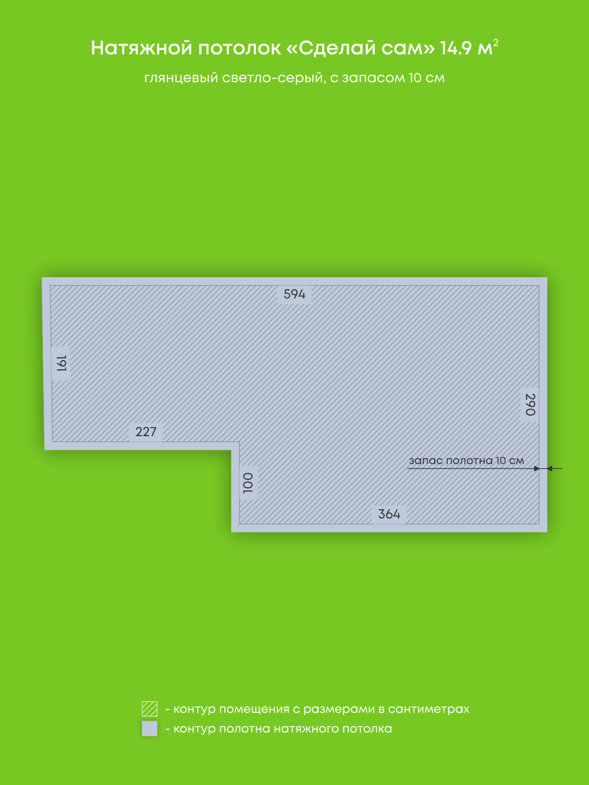 Натяжной потолок светло-серый глянцевый, изготовленный по индивидуальным размерам покупателя, для комнаты площадью 14.9 м2