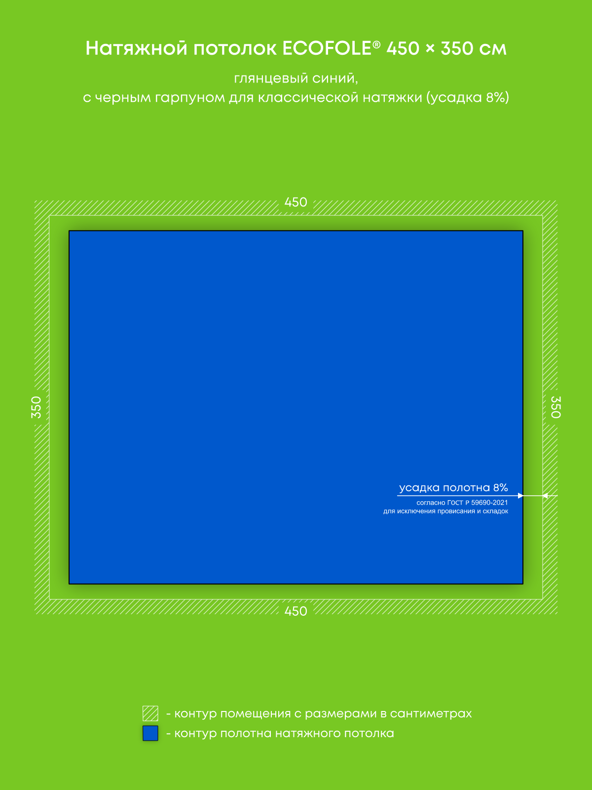 Натяжной потолок синий глянцевый, изготовленный по индивидуальным размерам покупателя, для комнаты площадью 15.8 м2