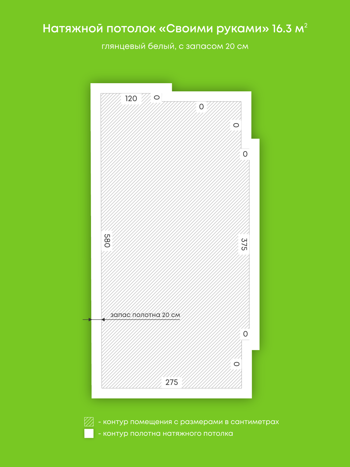 Натяжной потолок белый глянцевый, изготовленный по индивидуальным размерам покупателя, для комнаты площадью 16.3 м2