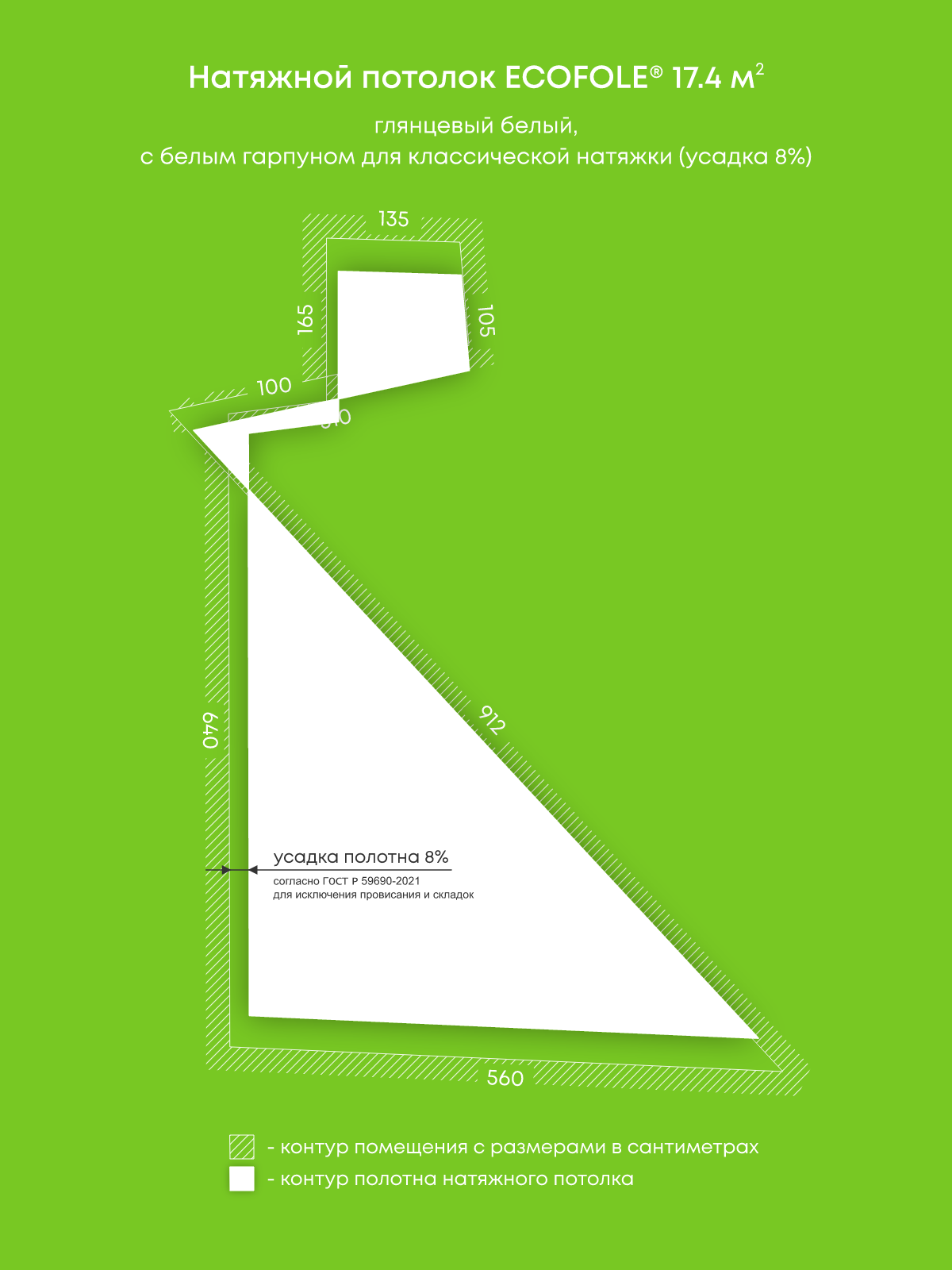 Натяжной потолок белый глянцевый, изготовленный по индивидуальным размерам покупателя, для гостиной площадью 17.4 м2