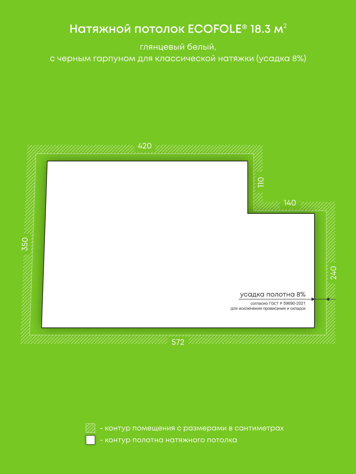 Натяжной потолок белый глянцевый, изготовленный по индивидуальным размерам покупателя, для комнаты площадью 18.3 м2