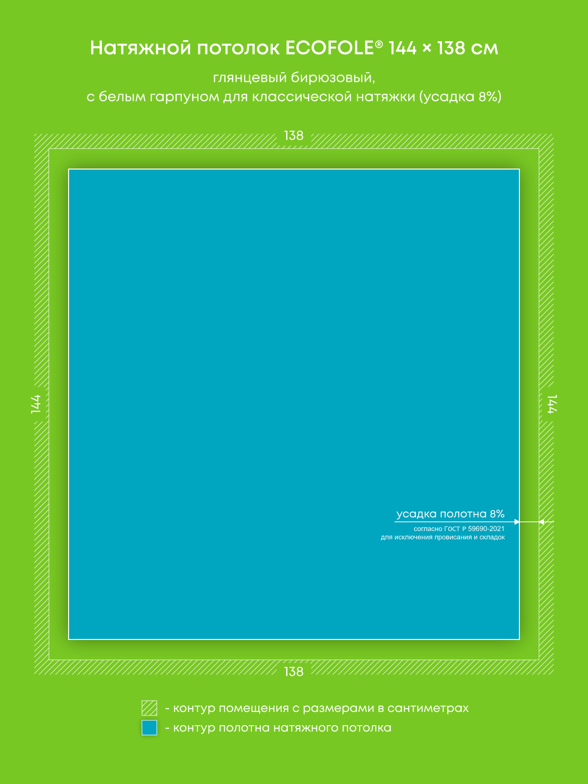 Натяжной потолок бирюзовый глянцевый, изготовленный по индивидуальным размерам покупателя, для помещения площадью 2 м2