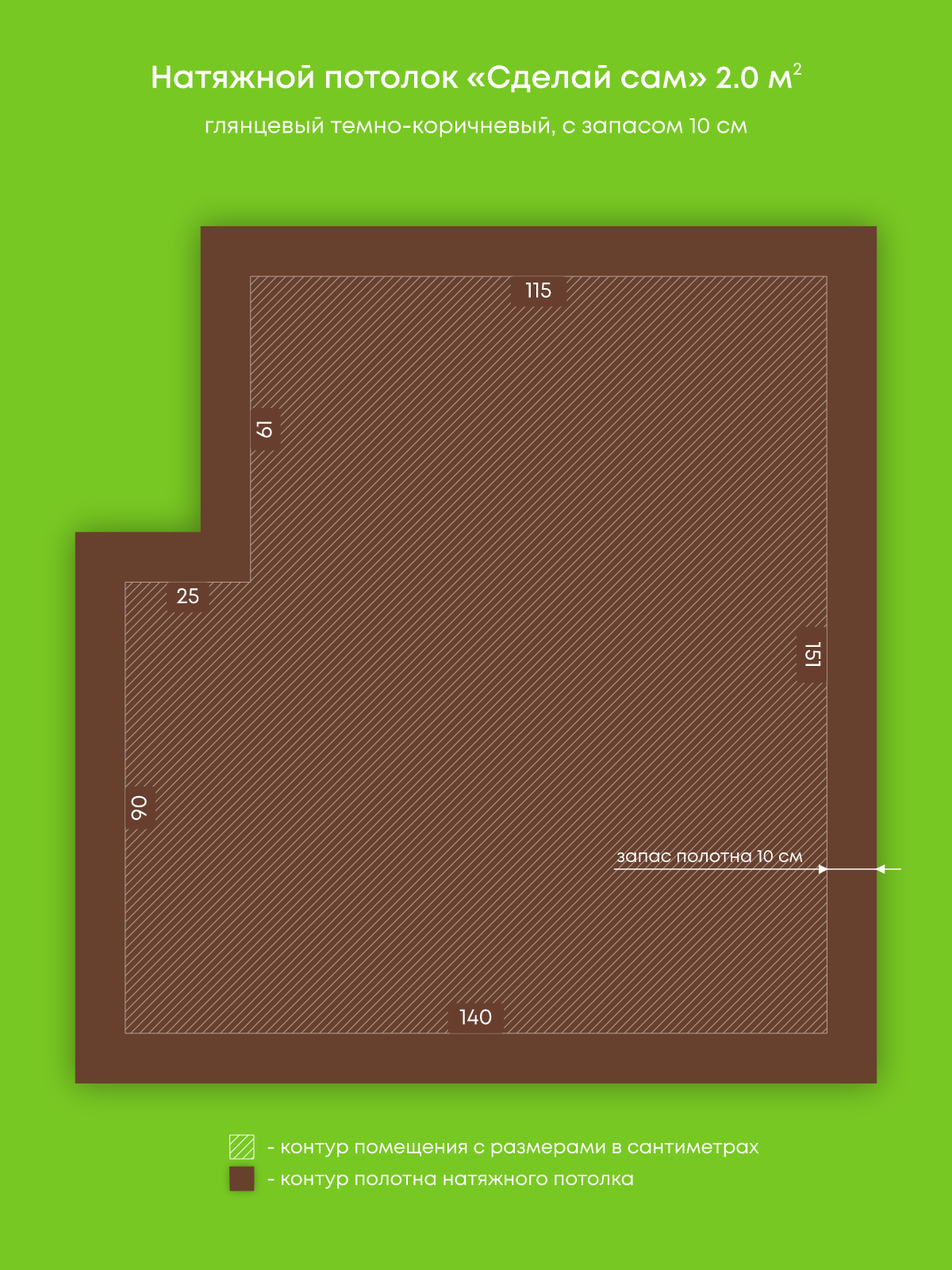 Натяжной потолок темно-коричневый глянцевый, изготовленный по индивидуальным размерам покупателя, для помещения площадью 2 м2