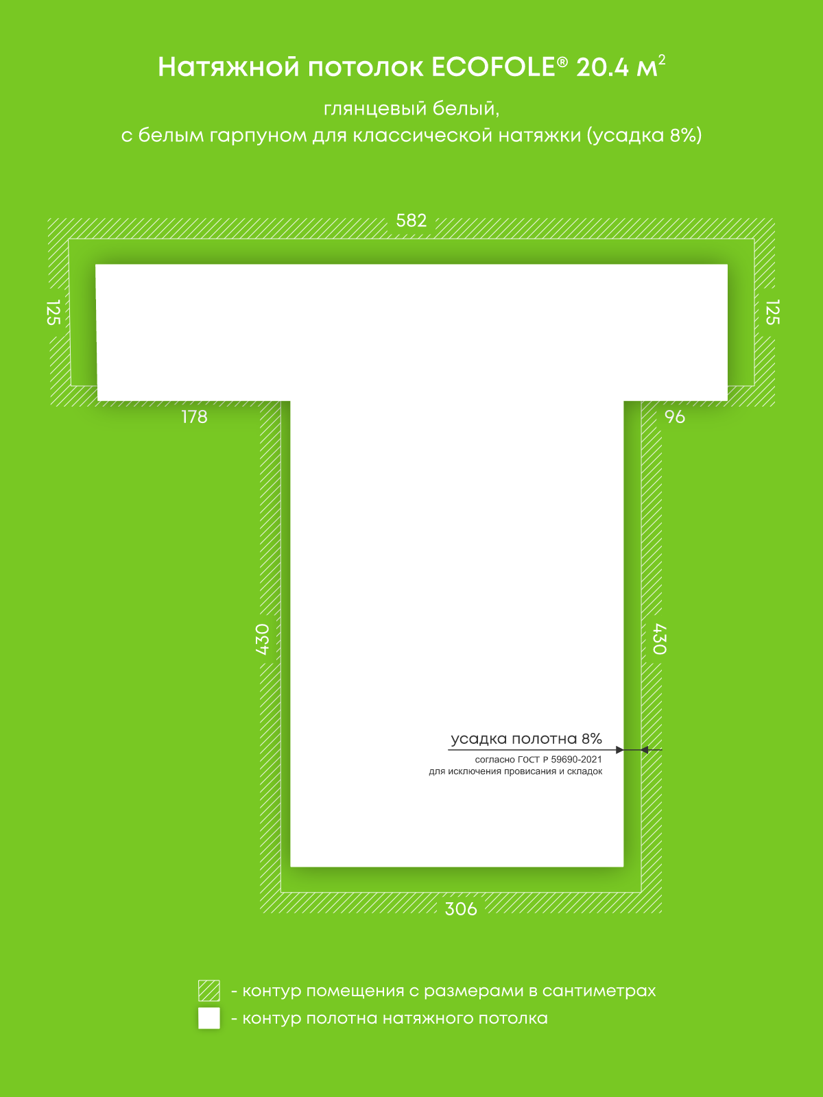 Натяжной потолок белый глянцевый, изготовленный по индивидуальным размерам покупателя, для гостиной площадью 20.4 м2