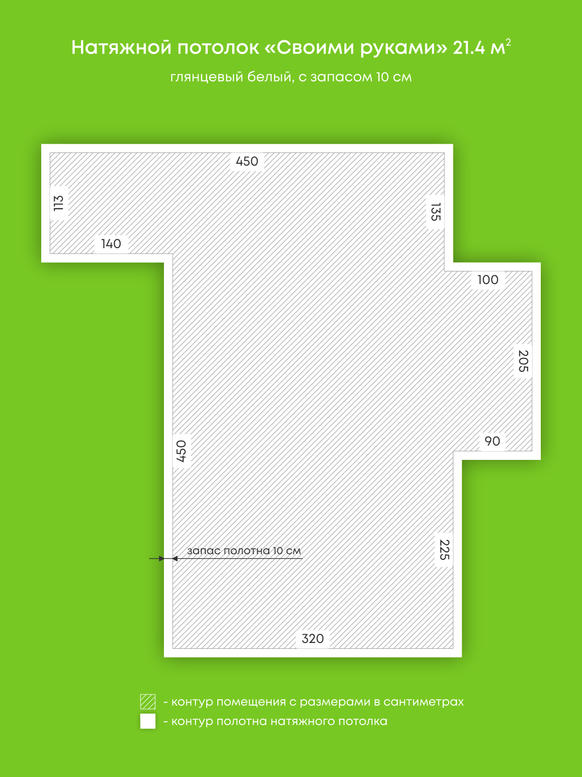 Натяжной потолок белый глянцевый, изготовленный по индивидуальным размерам покупателя, для гостиной площадью 21.4 м2