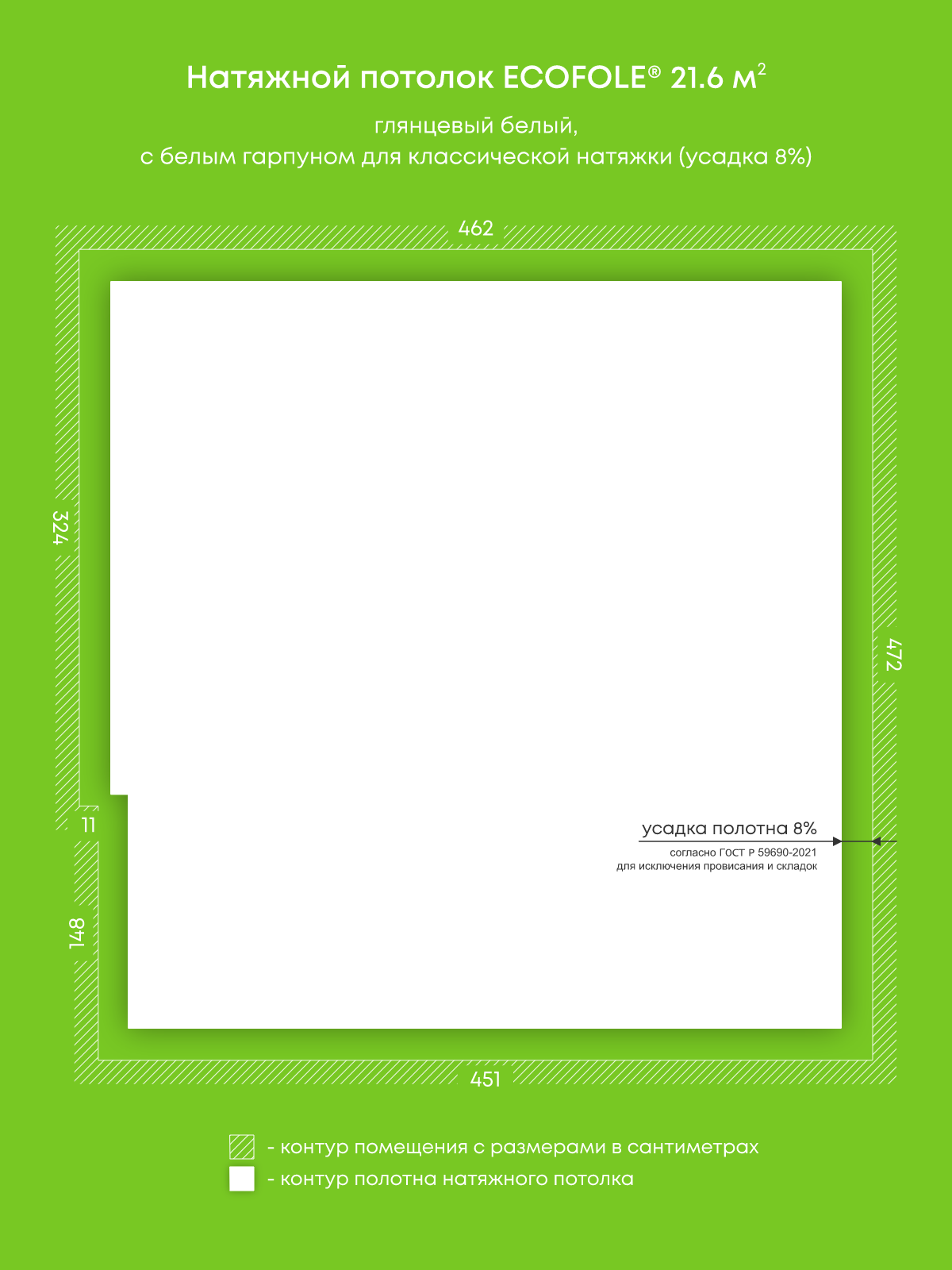 Натяжной потолок белый глянцевый, изготовленный по индивидуальным размерам покупателя, для гостиной площадью 21.6 м2