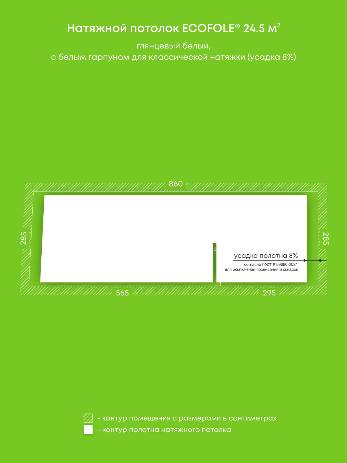 Натяжной потолок белый глянцевый, изготовленный по индивидуальным размерам покупателя, для спальни площадью 24.5 м2