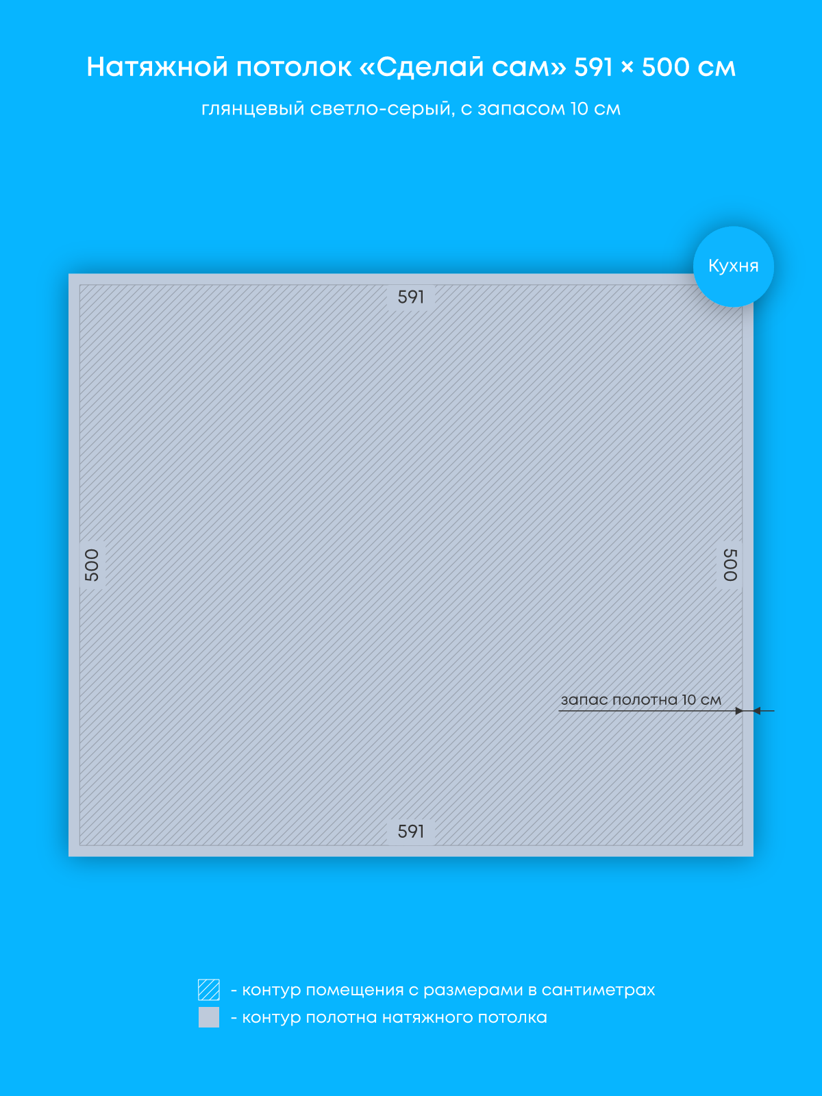 Натяжной потолок светло-серый глянцевый, изготовленный по индивидуальным размерам покупателя, для кухни площадью 29.6 м2