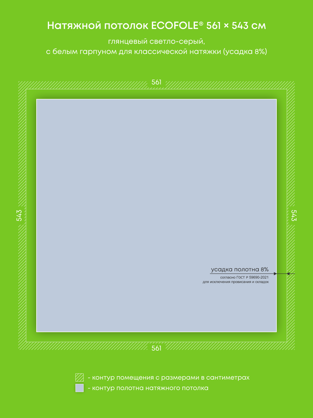 Натяжной потолок светло-серый глянцевый, изготовленный по индивидуальным размерам покупателя, для комнаты площадью 30.5 м2