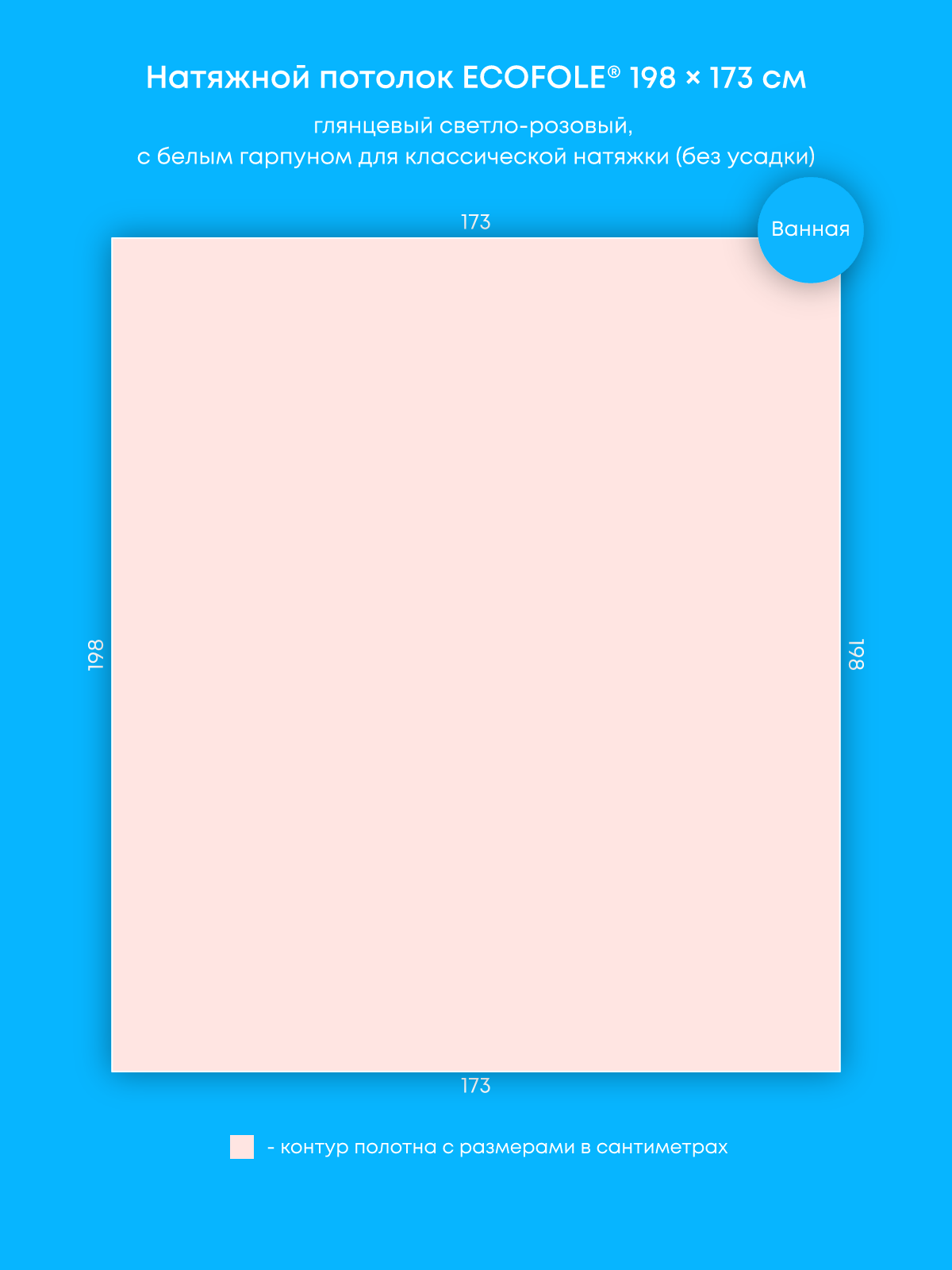 Натяжной потолок светло-розовый глянцевый, классической натяжки, изготовленный по индивидуальным размерам покупателя, для помещения площадью 3.4 м2