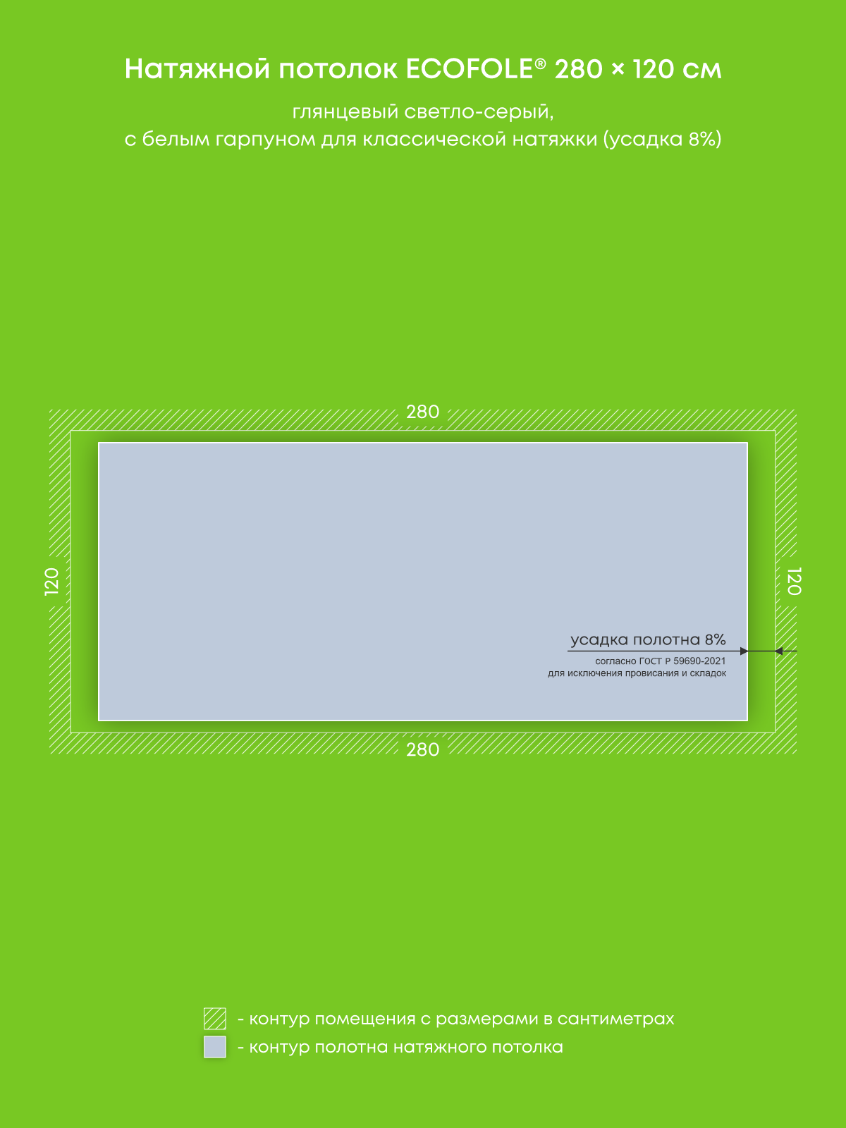 Натяжной потолок светло-серый глянцевый, изготовленный по индивидуальным размерам покупателя, для спальни площадью 3.4 м2