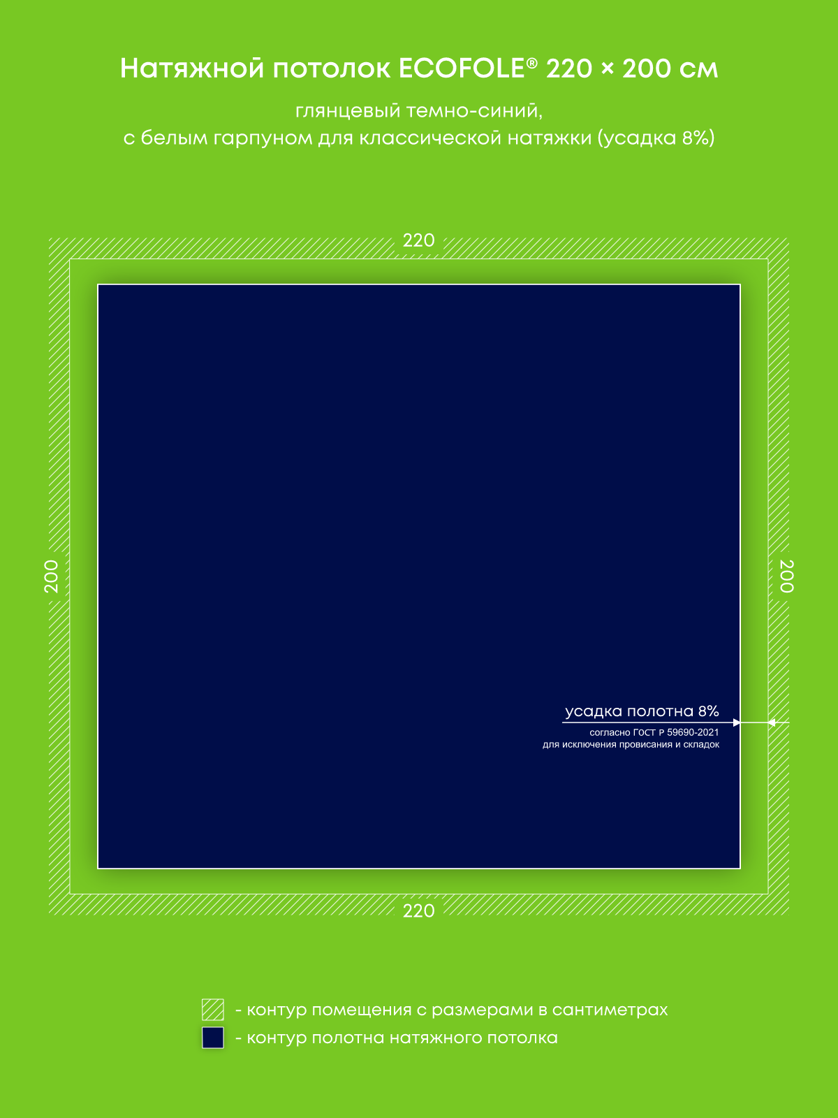 Натяжной потолок темно-синий глянцевый, изготовленный по индивидуальным размерам покупателя, для ванной площадью 4.4 м2