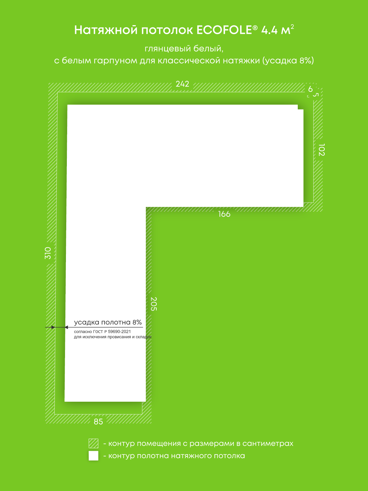 Натяжной потолок белый глянцевый, изготовленный по индивидуальным размерам покупателя, для помещения площадью 4.4 м2