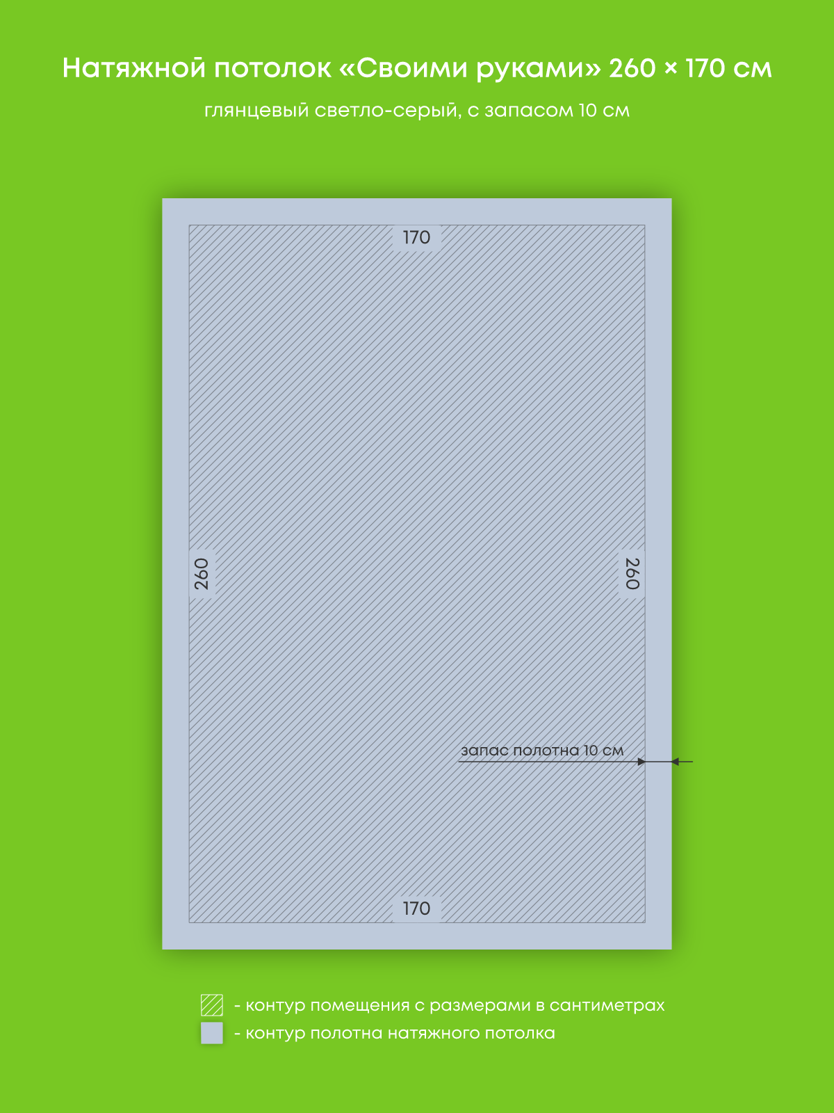 Натяжной потолок светло-серый глянцевый, изготовленный по индивидуальным размерам покупателя, для комнаты площадью 4.4 м2