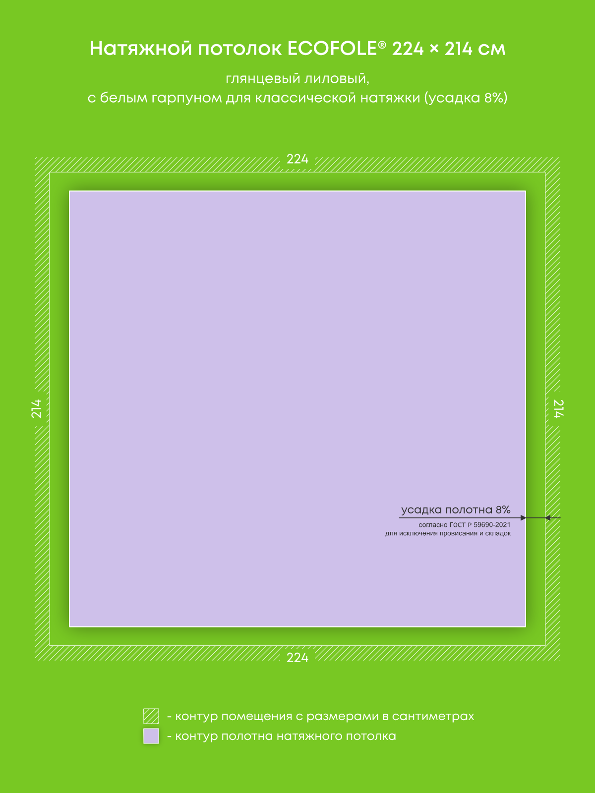 Натяжной потолок лиловый глянцевый, изготовленный по индивидуальным размерам покупателя, для помещения площадью 4.8 м2