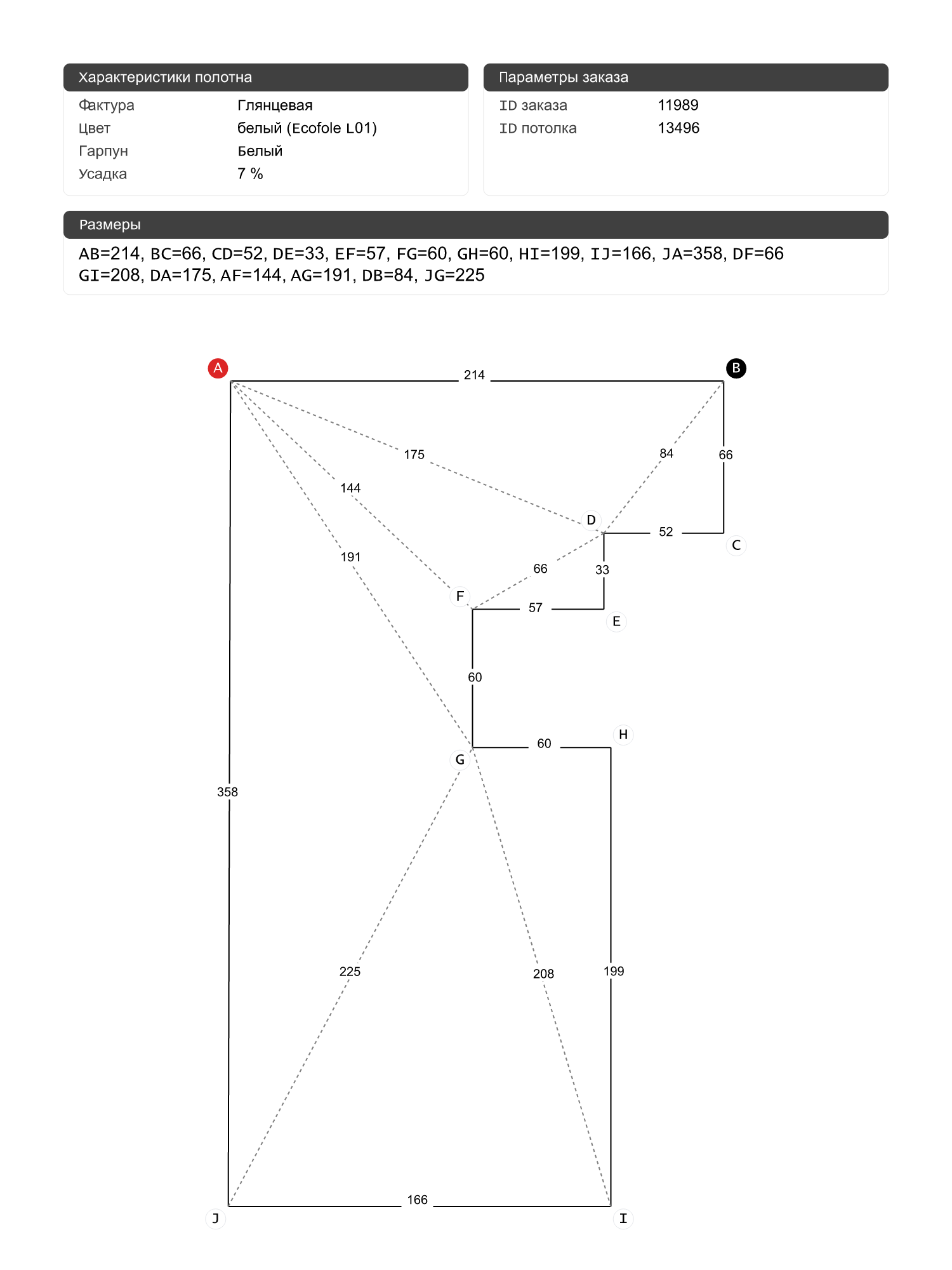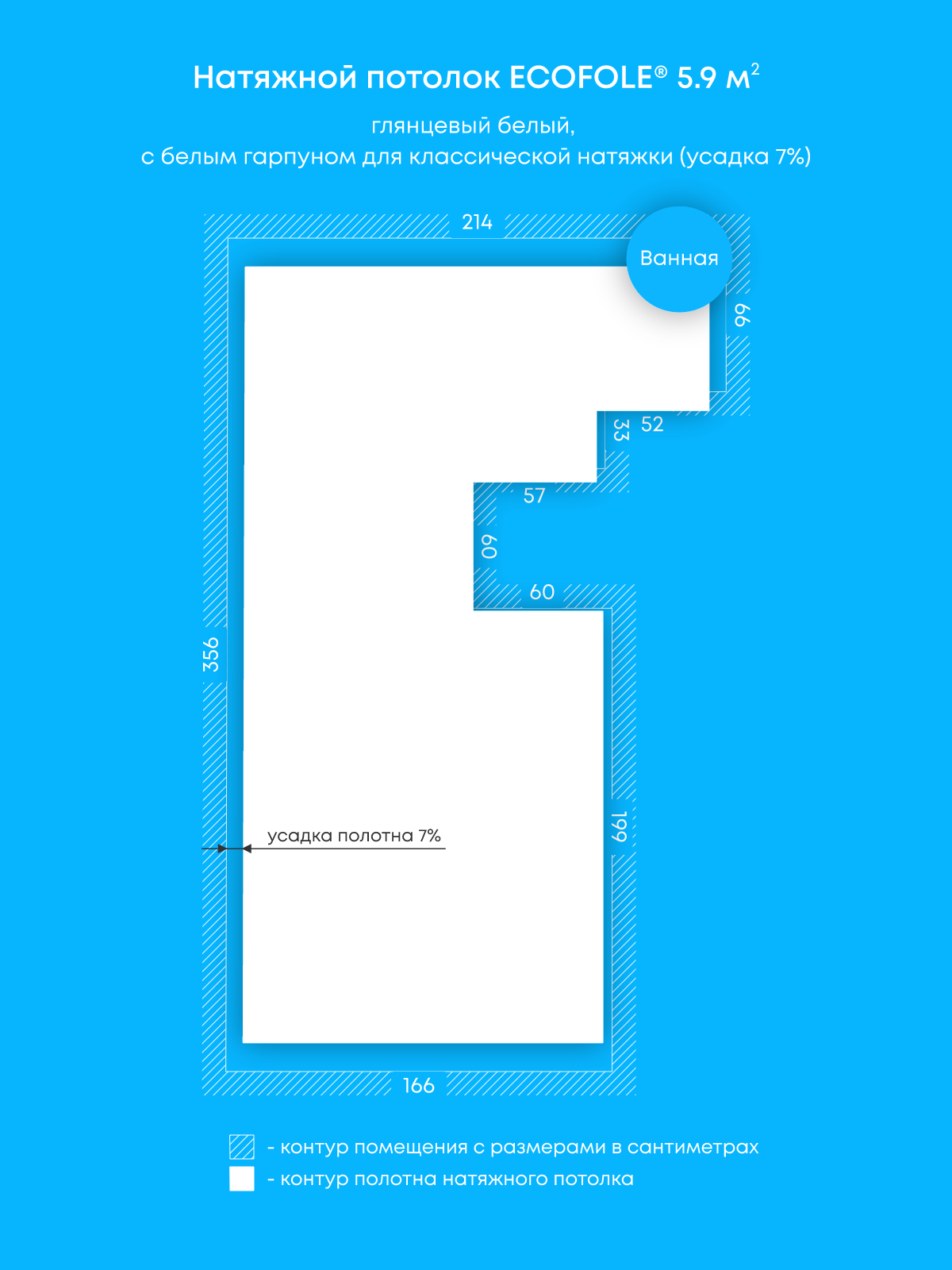 Натяжной потолок белый глянцевый, классической натяжки, изготовленный по индивидуальным размерам покупателя, для помещения площадью 5.9 м2