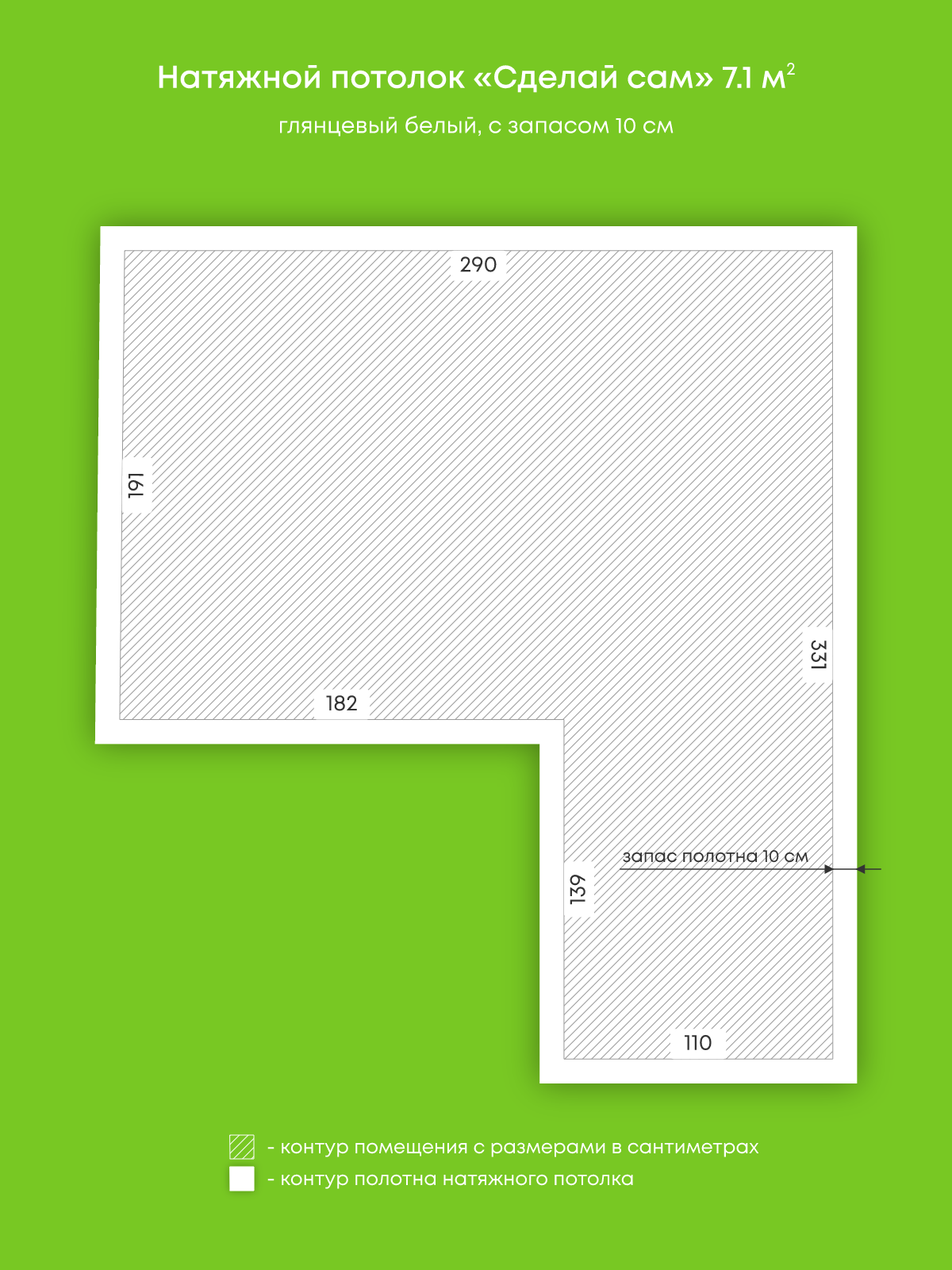 Натяжной потолок белый глянцевый, изготовленный по индивидуальным размерам покупателя, для помещения площадью 7.1 м2