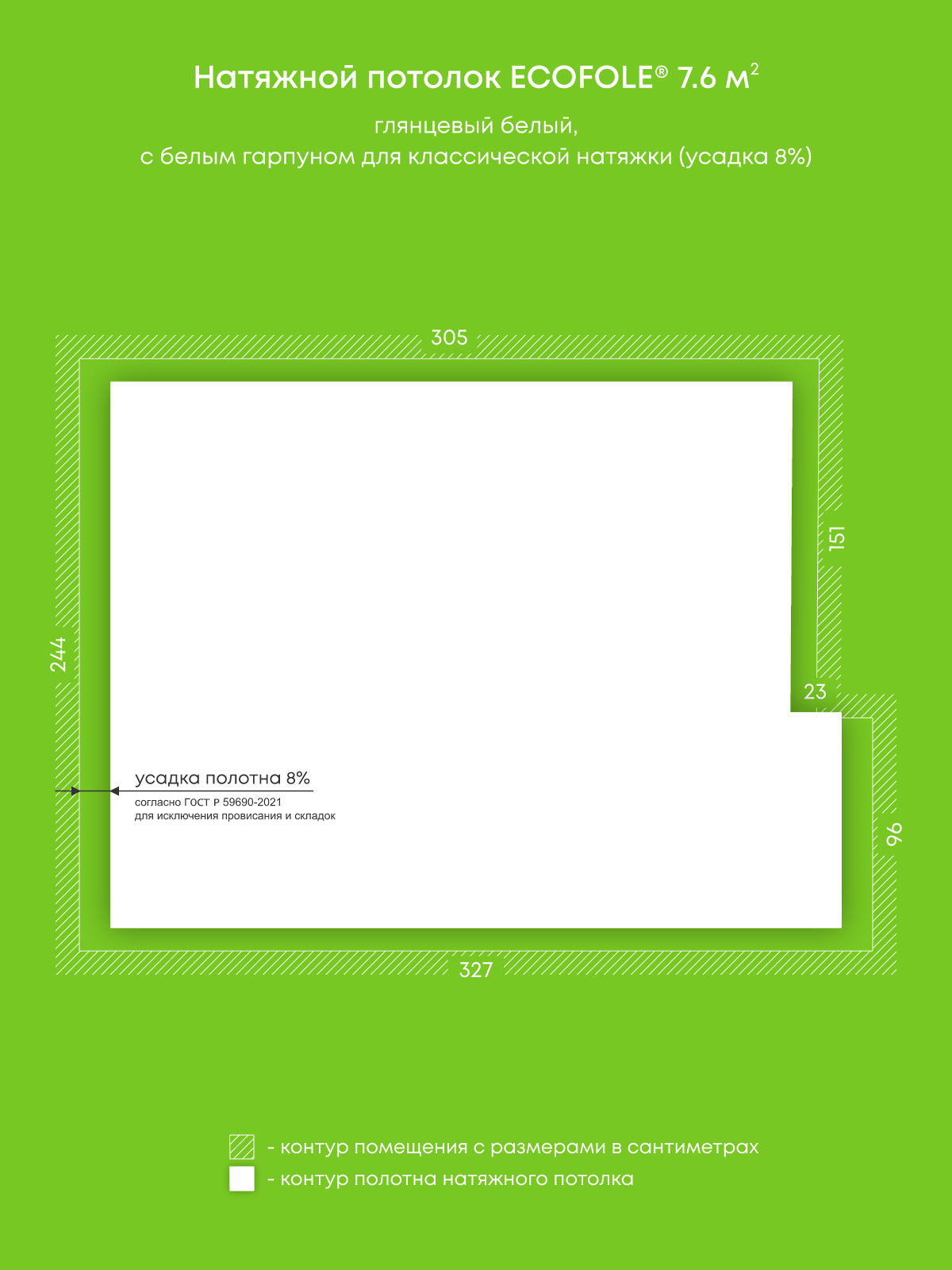 Натяжной потолок белый глянцевый, изготовленный по индивидуальным размерам покупателя, для помещения площадью 7.6 м2