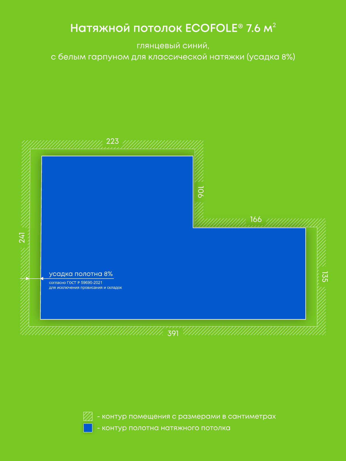 Натяжной потолок синий глянцевый, изготовленный по индивидуальным размерам покупателя, для комнаты площадью 7.6 м2
