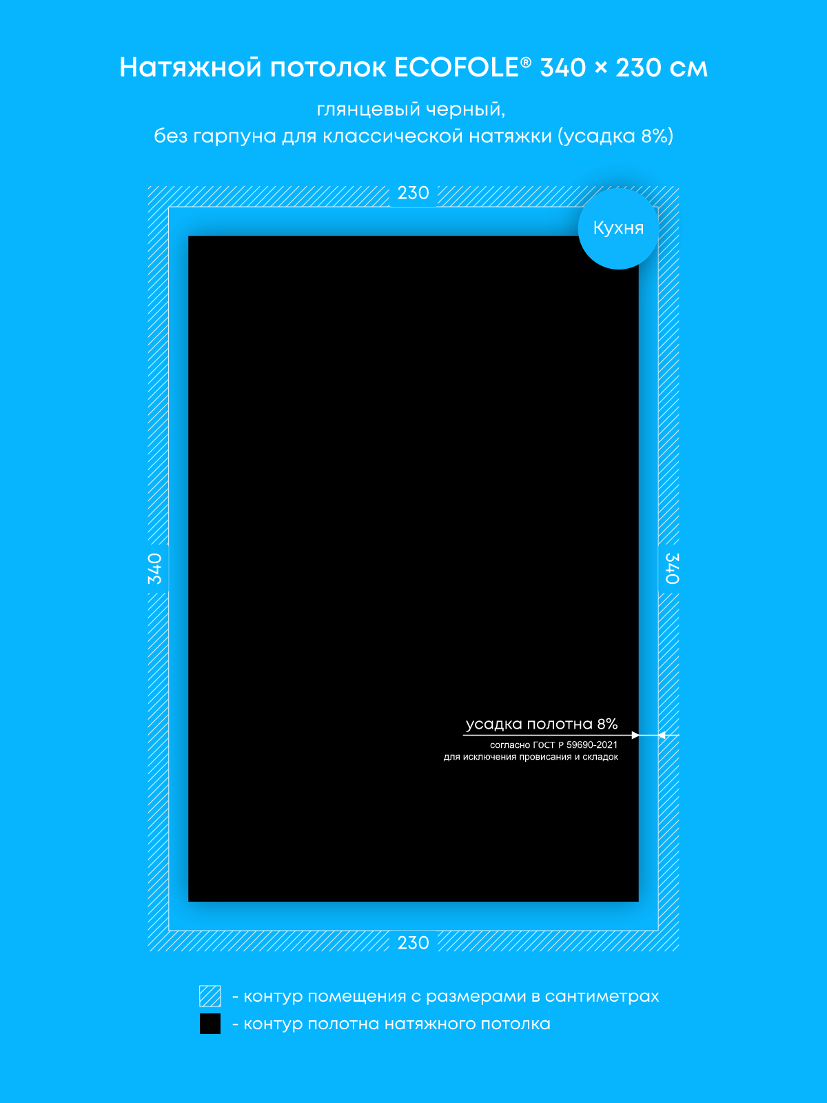Натяжной потолок черный глянцевый, изготовленный по индивидуальным размерам покупателя, для кухни площадью 7.8 м2