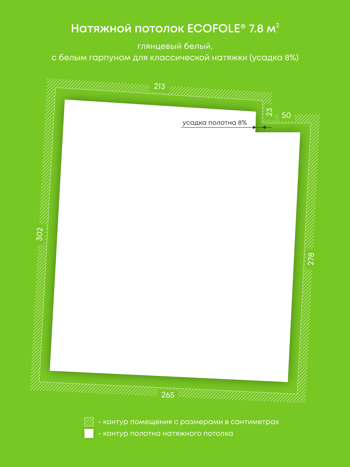 Натяжной потолок белый глянцевый, изготовленный по индивидуальным размерам покупателя, для кухни площадью 7.8 м2