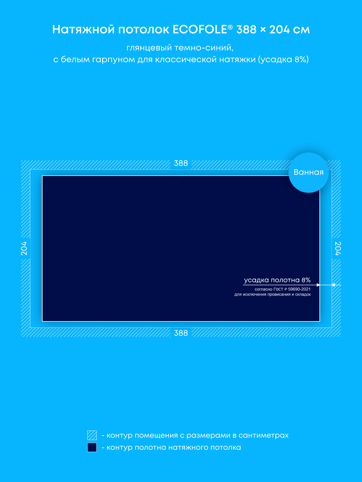 Натяжной потолок темно-синий глянцевый, классической натяжки, изготовленный по индивидуальным размерам покупателя, для помещения площадью 7.9 м2