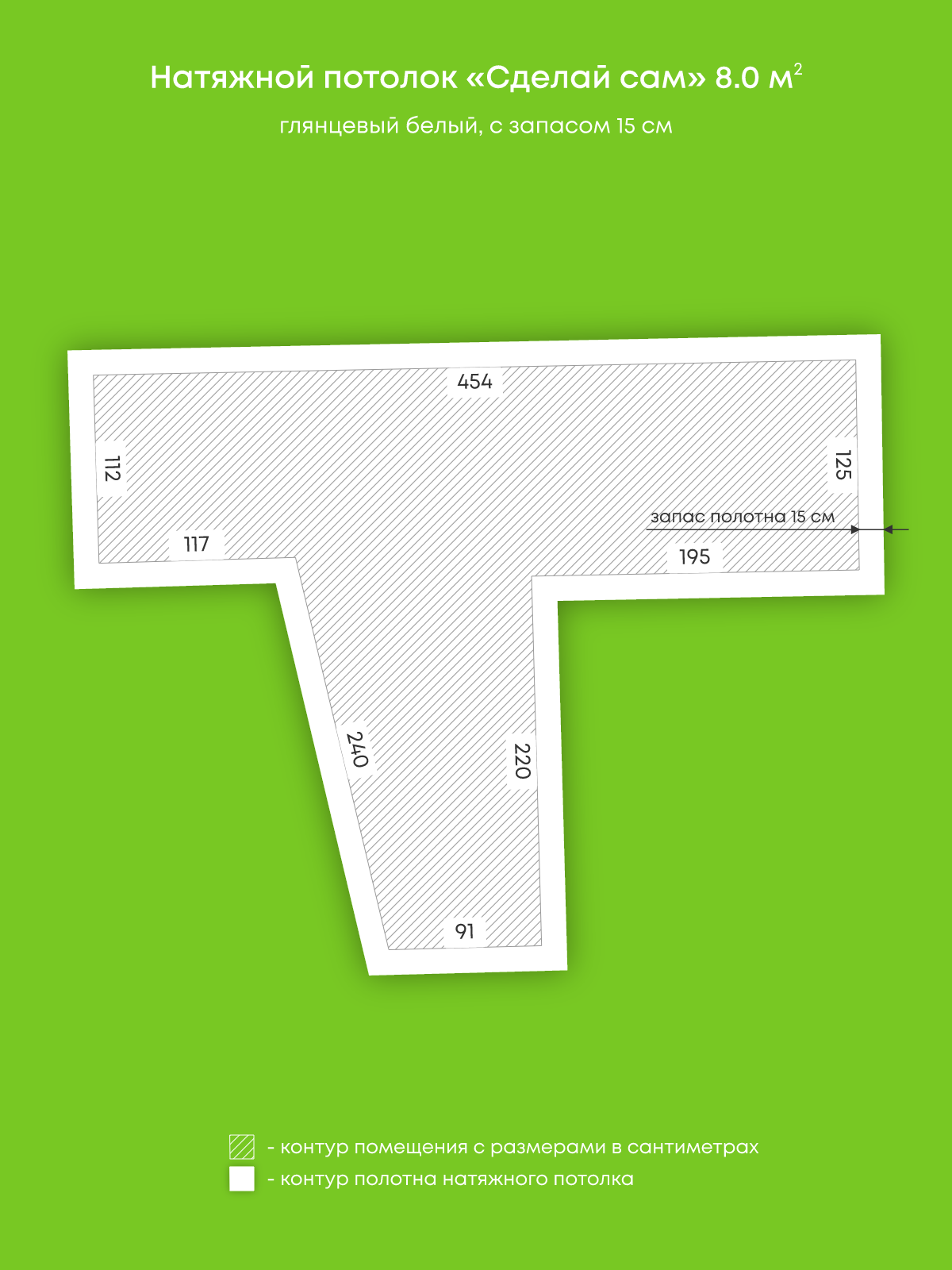 Натяжной потолок белый глянцевый, изготовленный по индивидуальным размерам покупателя, для комнаты площадью 8 м2