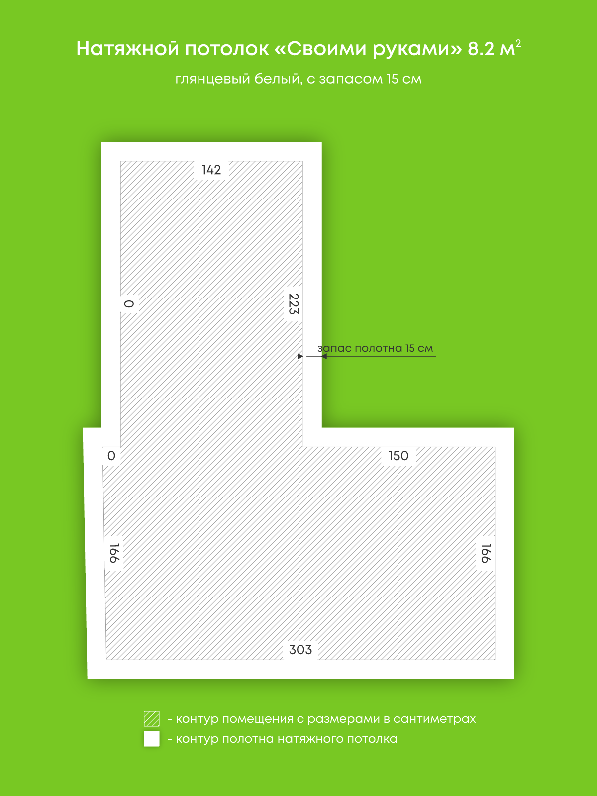 Натяжной потолок белый глянцевый, изготовленный по индивидуальным размерам покупателя, для помещения площадью 8.2 м2