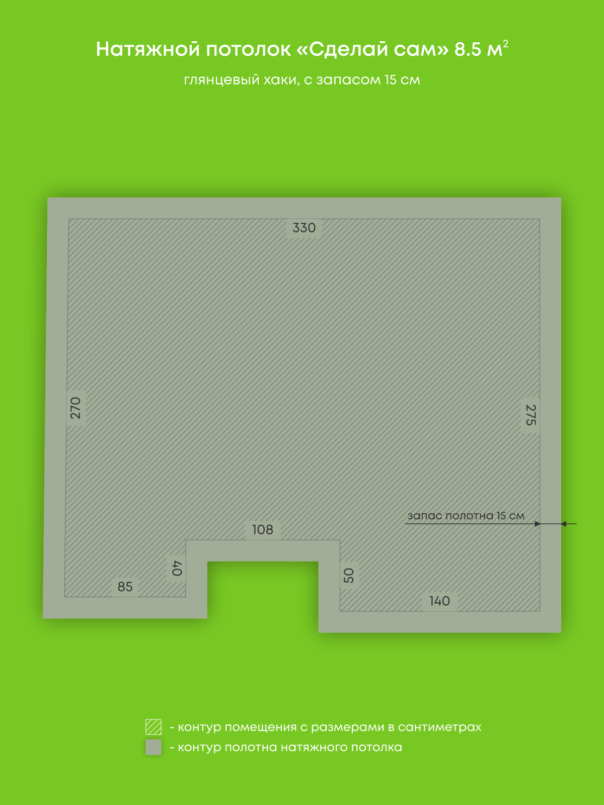 Натяжной потолок хаки глянцевый, изготовленный по индивидуальным размерам покупателя, для кухни площадью 8.5 м2