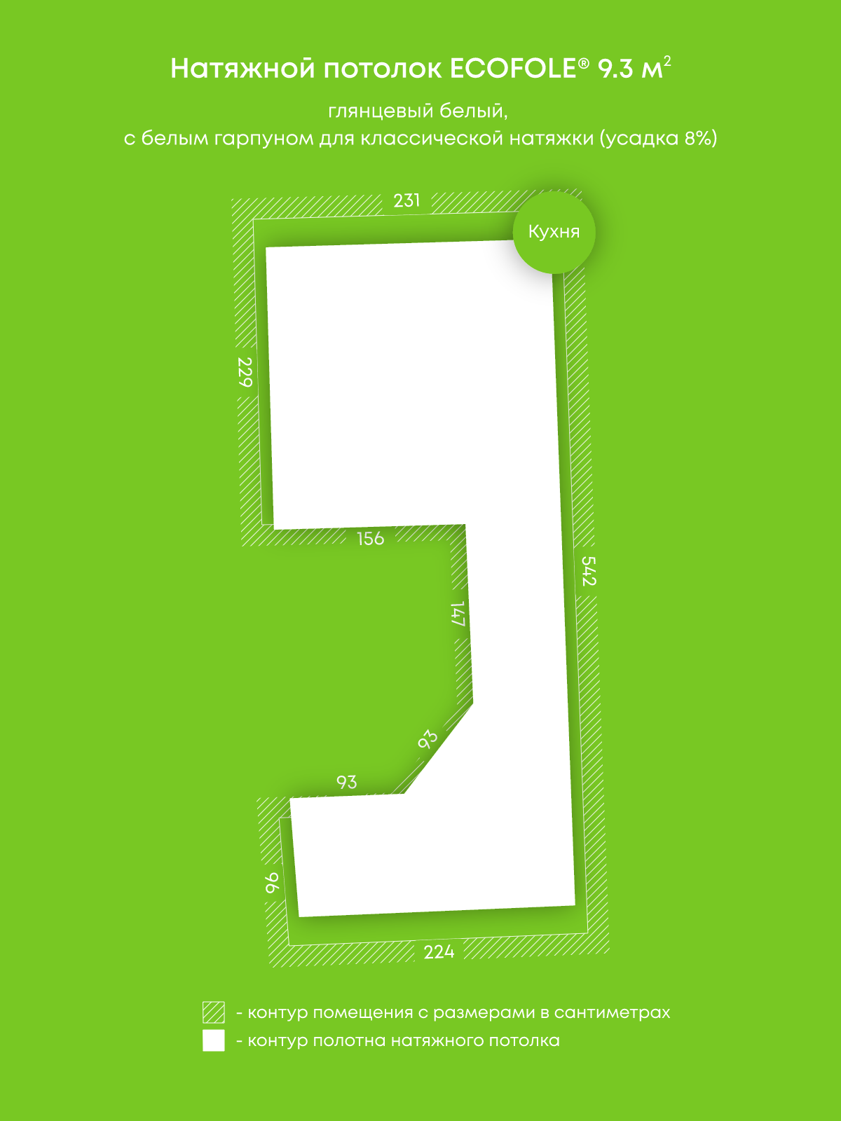 Натяжной потолок белый глянцевый, изготовленный по индивидуальным размерам покупателя, для кухни площадью 9.3 м2