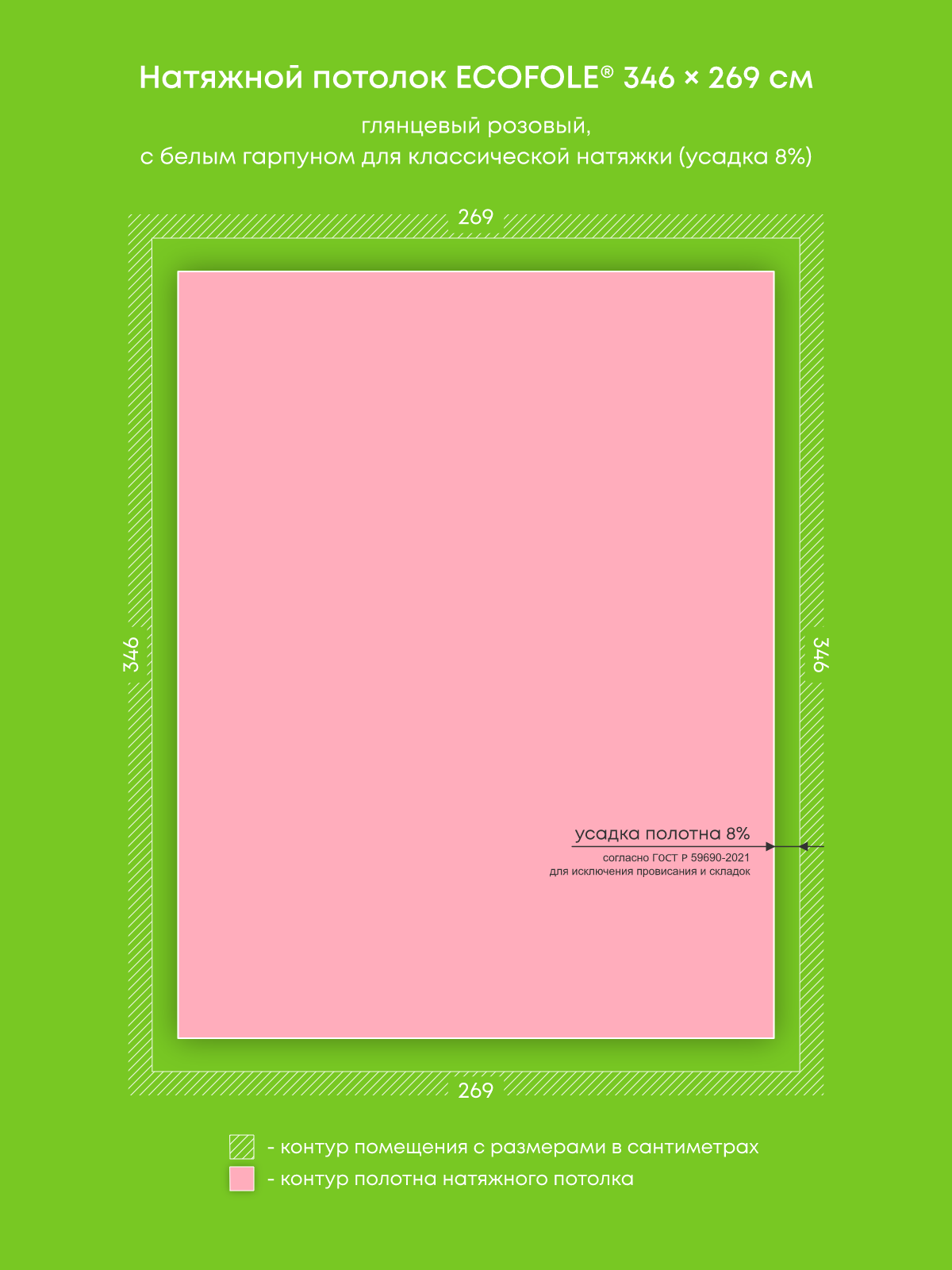 Натяжной потолок розовый глянцевый, изготовленный по индивидуальным размерам покупателя, для гостиной площадью 9.3 м2