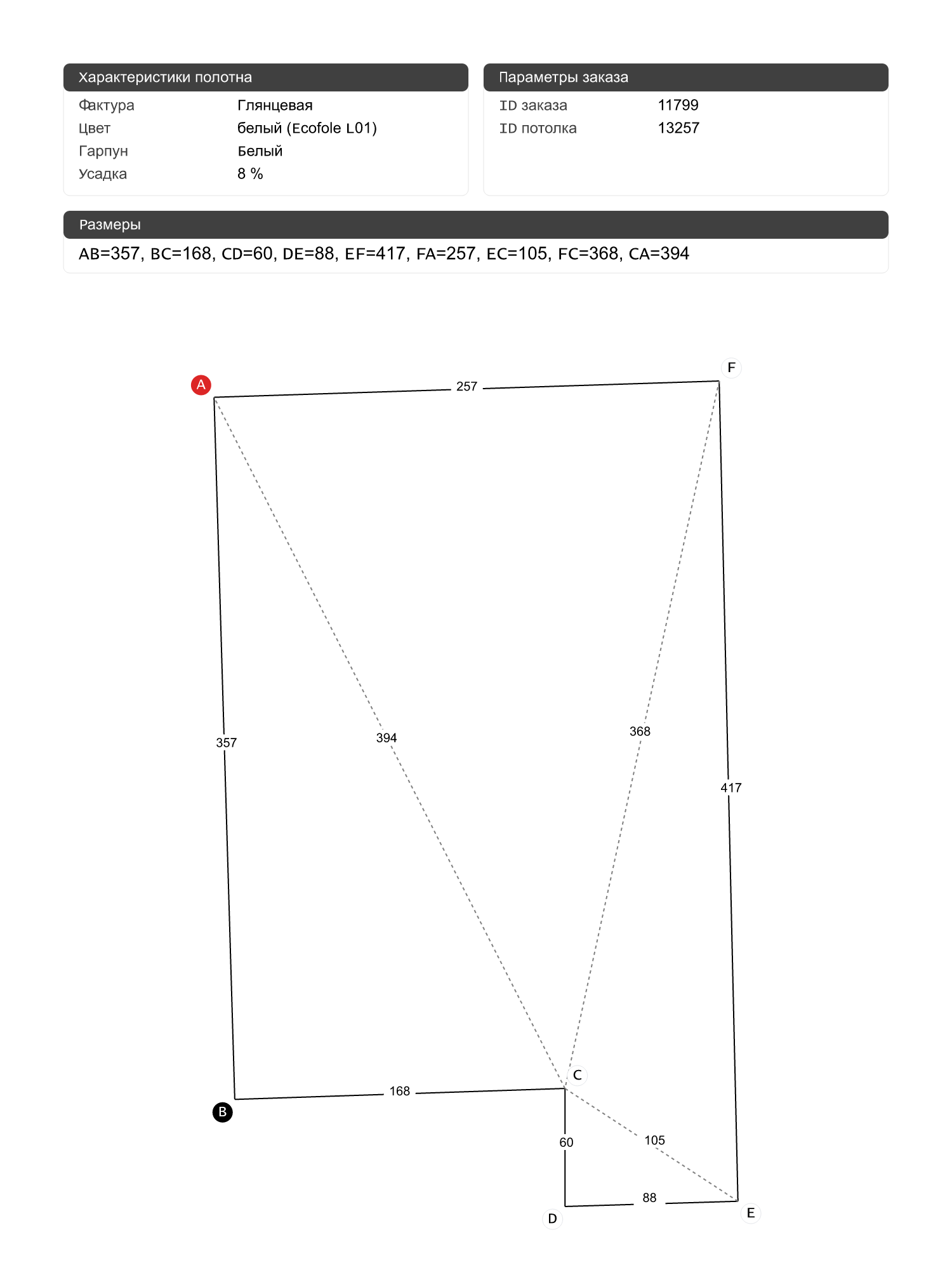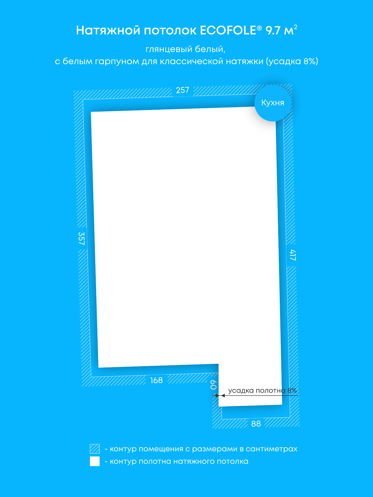 Натяжной потолок белый глянцевый, классической натяжки, изготовленный по индивидуальным размерам покупателя, для помещения площадью 9.7 м2