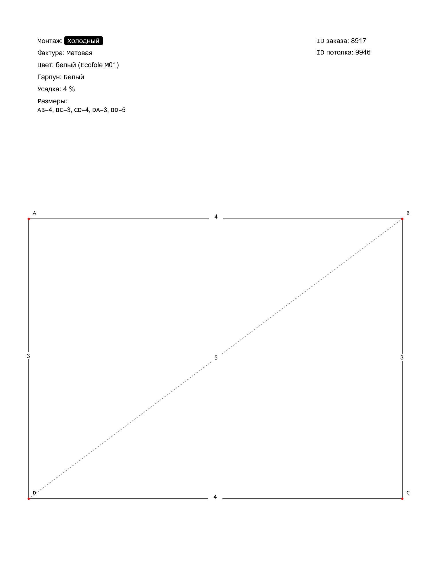 Натяжной потолок белый матовый, холодной натяжки, изготовленный по индивидуальным размерам покупателя