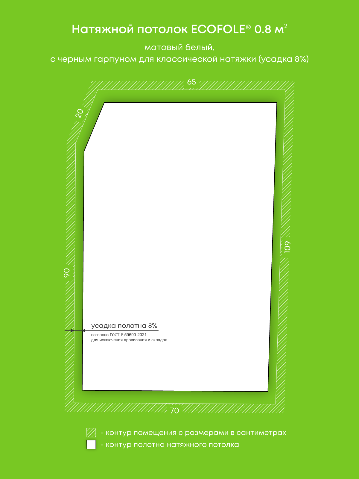 Натяжной потолок белый матовый, изготовленный по индивидуальным размерам покупателя, для помещения площадью 0.8 м2