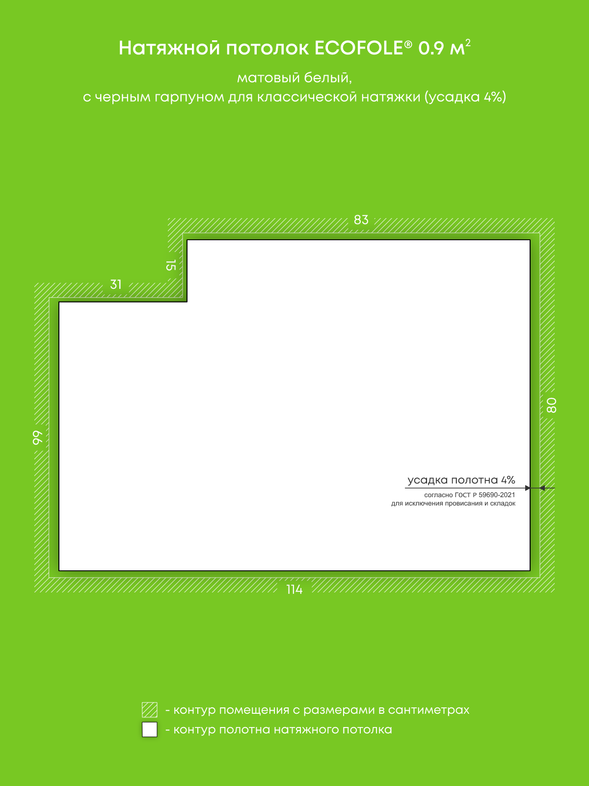 Натяжной потолок белый матовый, изготовленный по индивидуальным размерам покупателя, для помещения площадью 0.9 м2