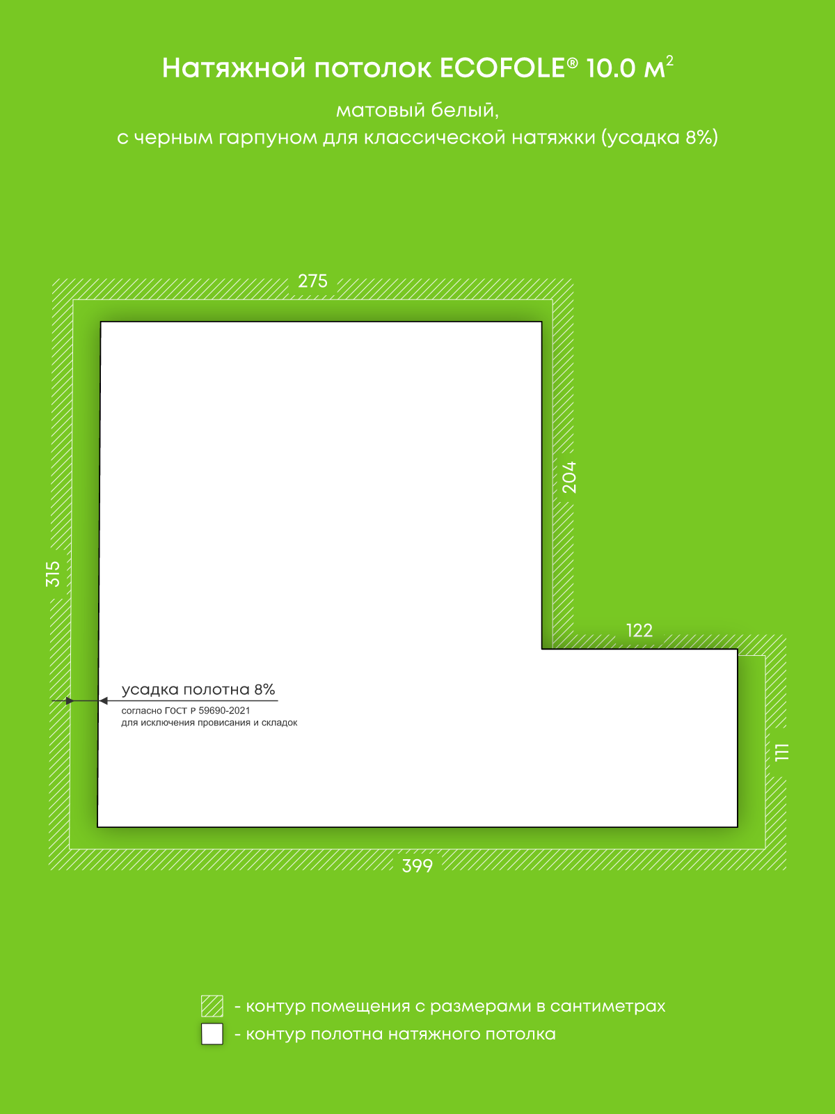 Натяжной потолок белый матовый, изготовленный по индивидуальным размерам покупателя, для комнаты площадью 10 м2