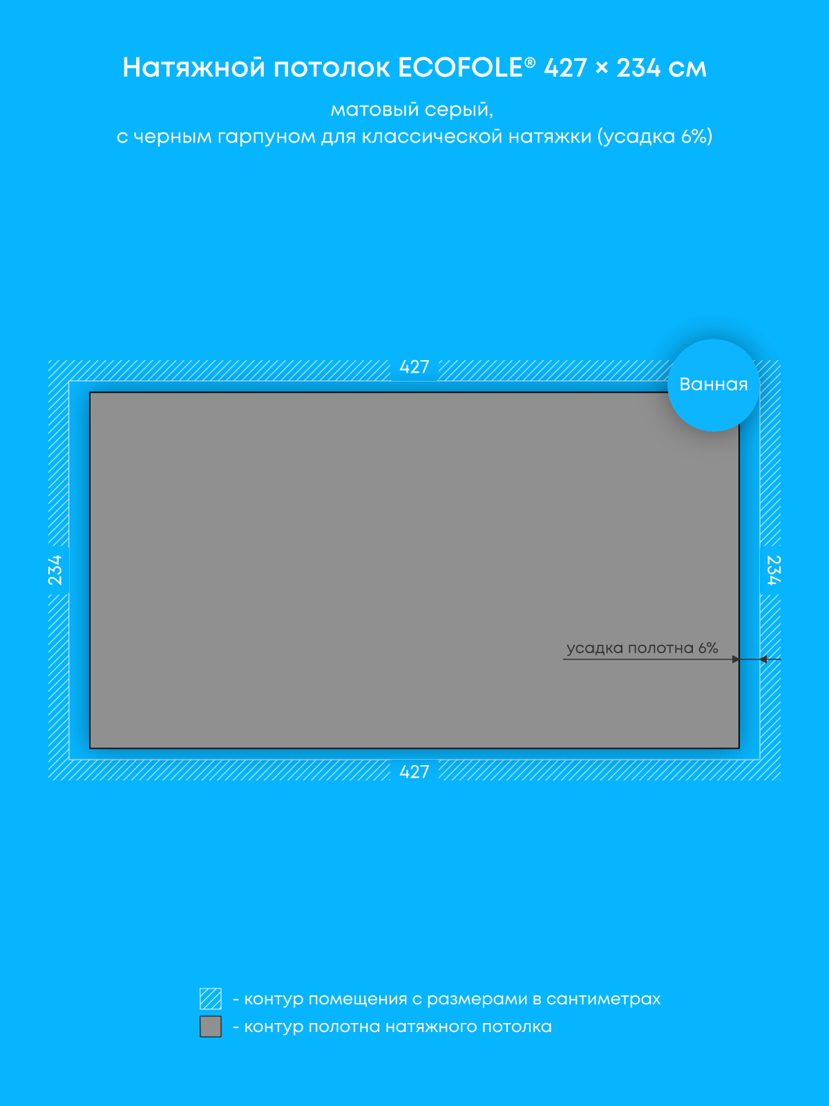 Натяжной потолок серый матовый, изготовленный по индивидуальным размерам покупателя, для ванной площадью 10 м2
