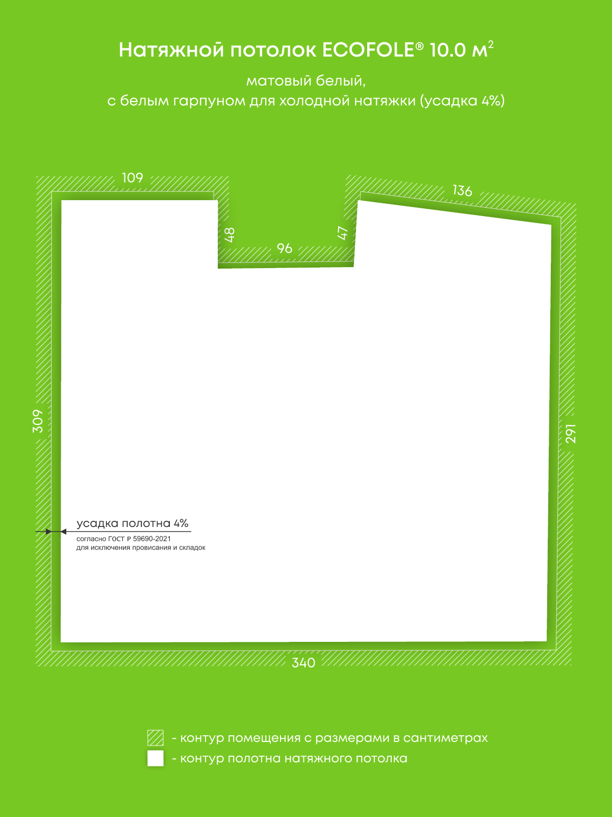 Натяжной потолок белый матовый, изготовленный по индивидуальным размерам покупателя, для помещения площадью 10 м2