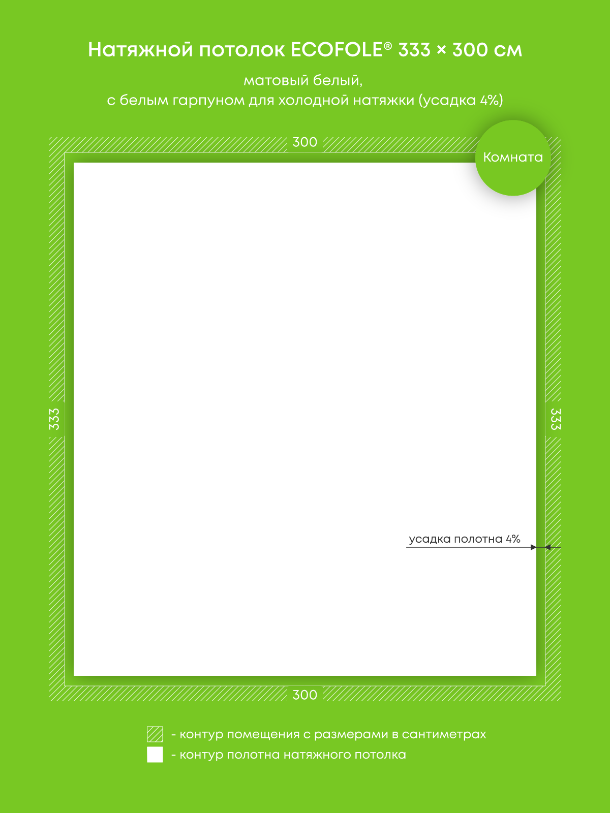 Натяжной потолок белый матовый, изготовленный по индивидуальным размерам покупателя, для комнаты площадью 10 м2