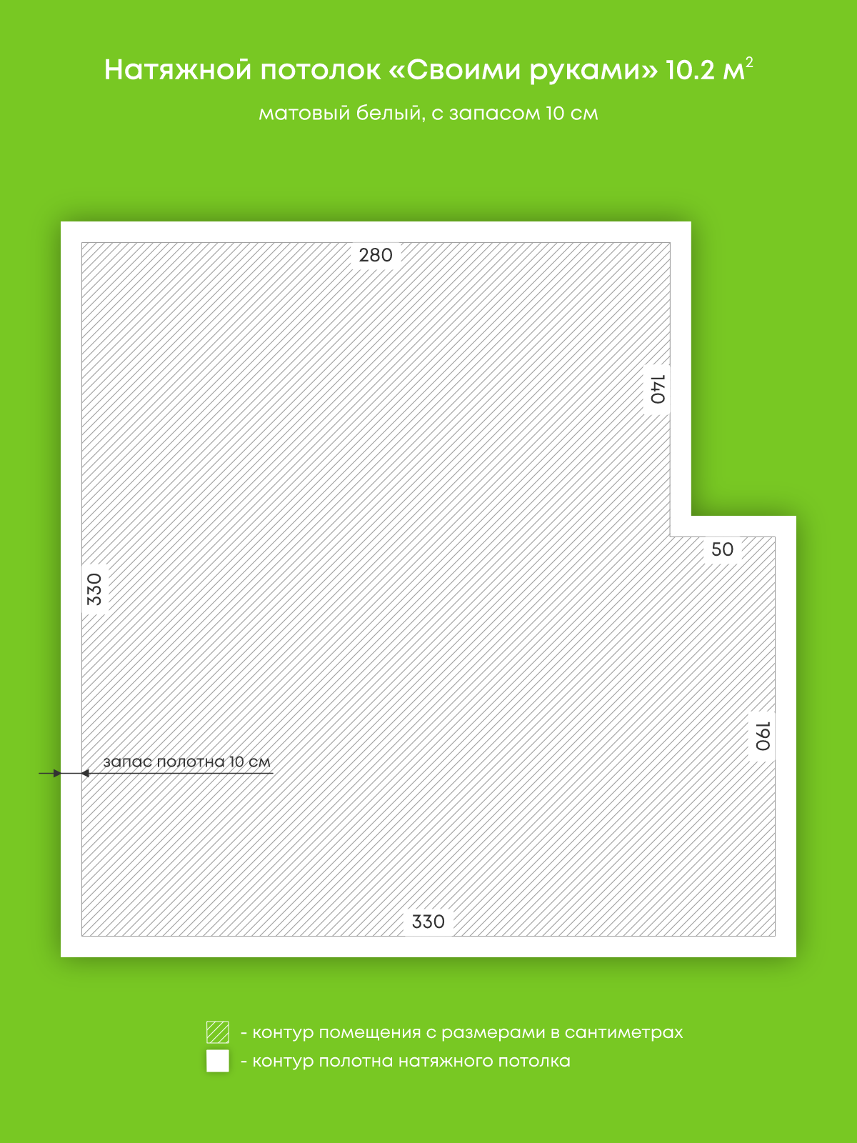 Натяжной потолок белый матовый, изготовленный по индивидуальным размерам покупателя, для кухни площадью 10.2 м2