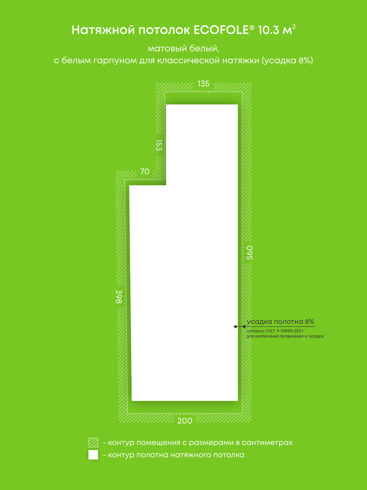 Натяжной потолок белый матовый, изготовленный по индивидуальным размерам покупателя, для помещения площадью 10.3 м2