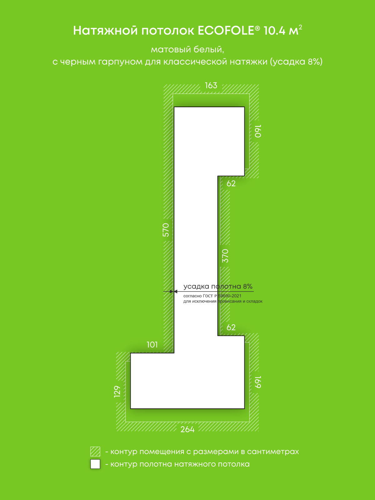 Натяжной потолок белый матовый, изготовленный по индивидуальным размерам покупателя, для помещения площадью 10.4 м2