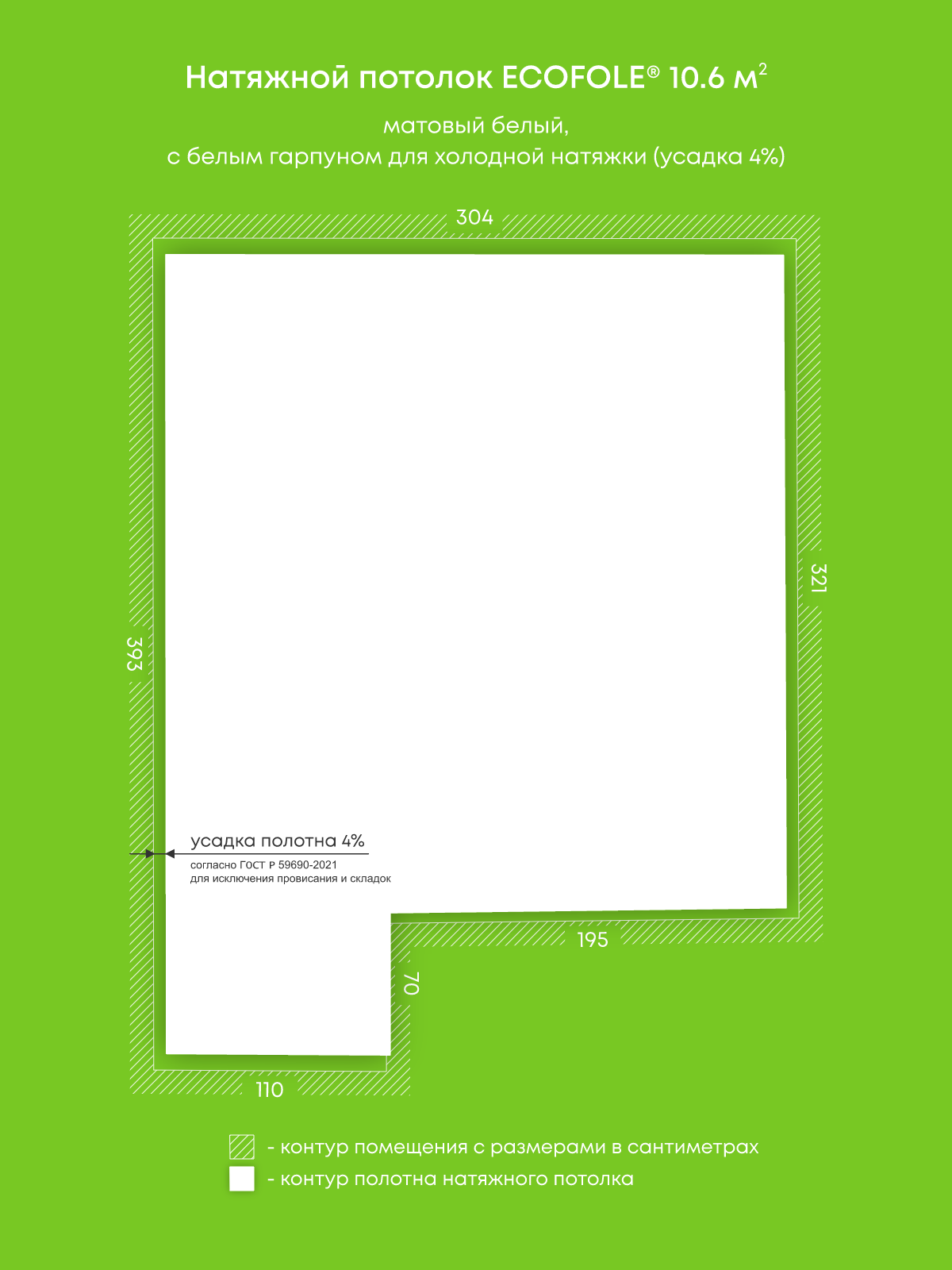 Натяжной потолок белый матовый, изготовленный по индивидуальным размерам покупателя, для комнаты площадью 10.6 м2