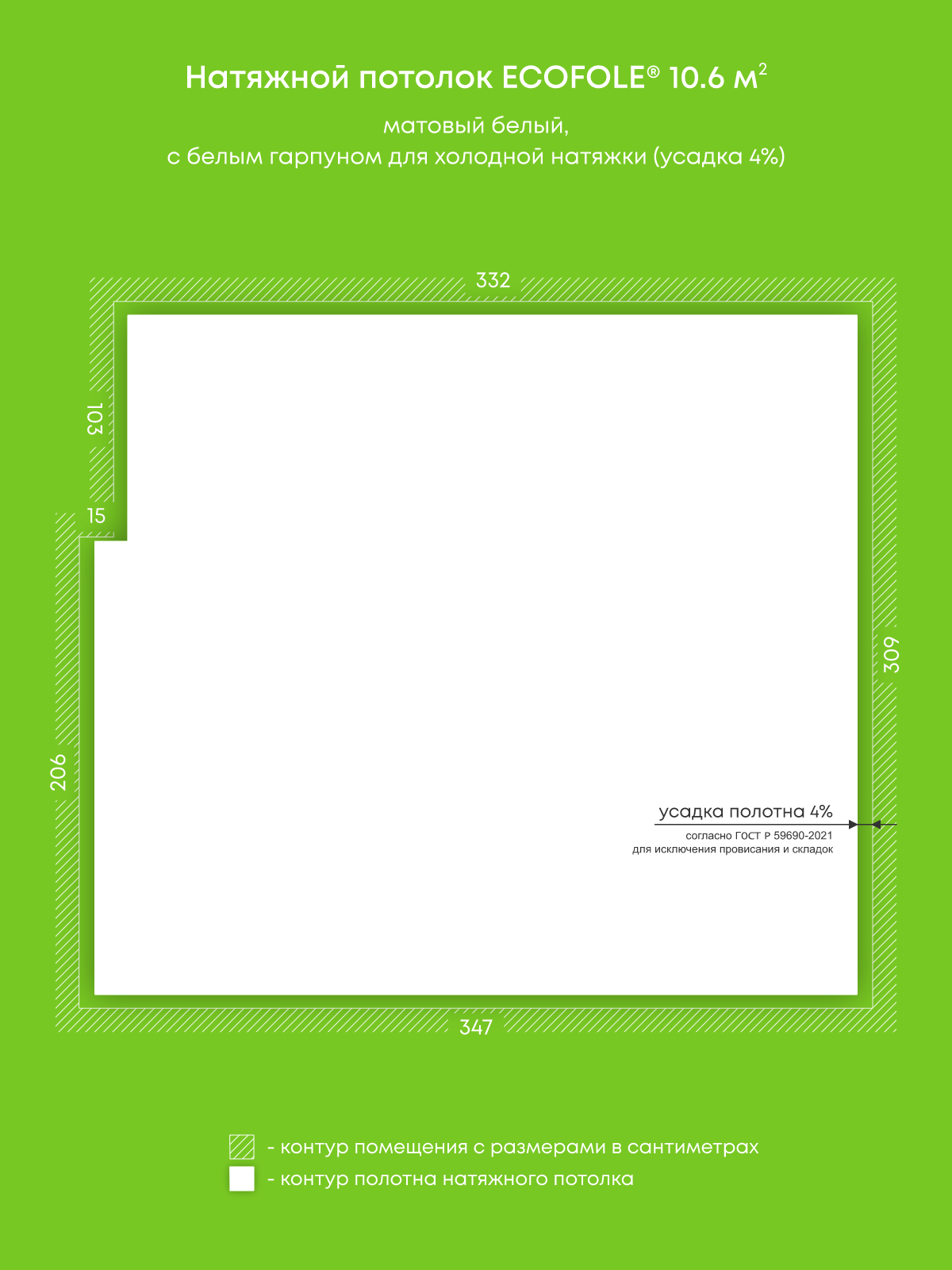 Натяжной потолок белый матовый, изготовленный по индивидуальным размерам покупателя, для комнаты площадью 10.6 м2